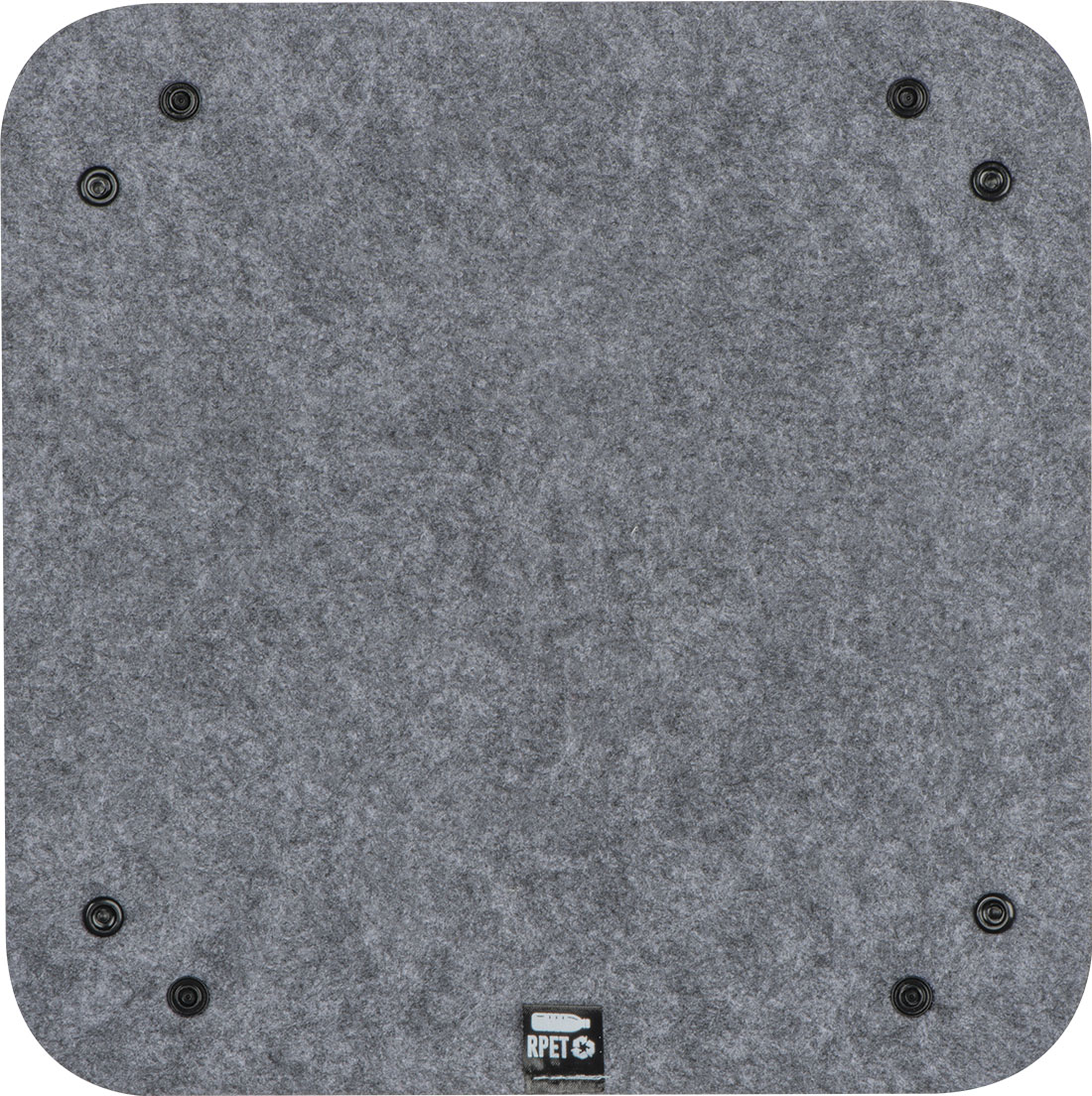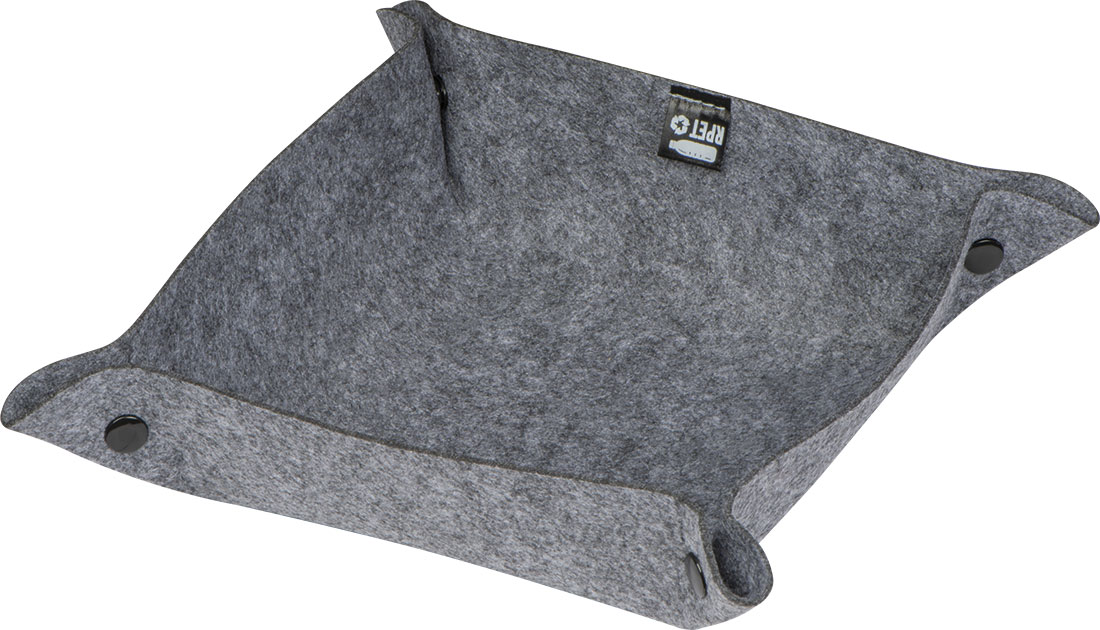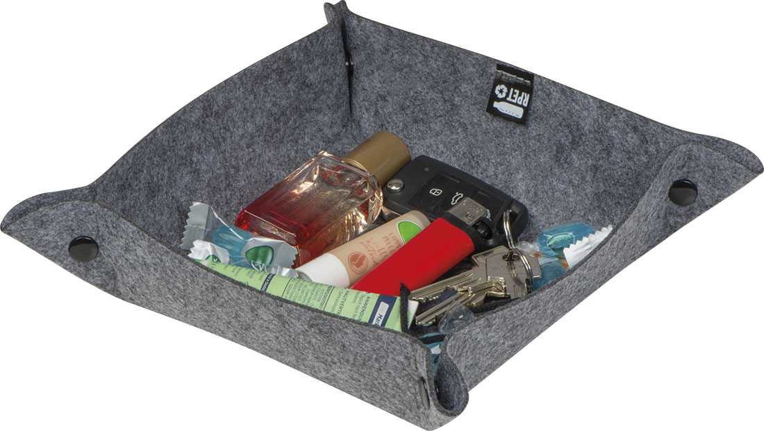 Tacka na klucze i inne drobiazgi, wykonana z filcu pochodzącego z recyklingu. To idealny, ekologiczny gadżet, na którego powierzchni można wykonać logo firmy, by skutecznie promować markę. Produkt ten nadaje się nie tylko jako praktyczna tacka na drobiazgi, ale również jako oryginalny prezent dla geeka w postaci wygłuszającej tacki na kości. Dzięki praktycznym zatrzaskom, można ją rozłożyć i przechowywać na płasko.