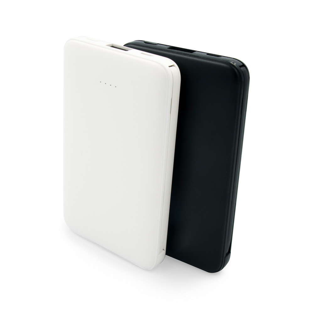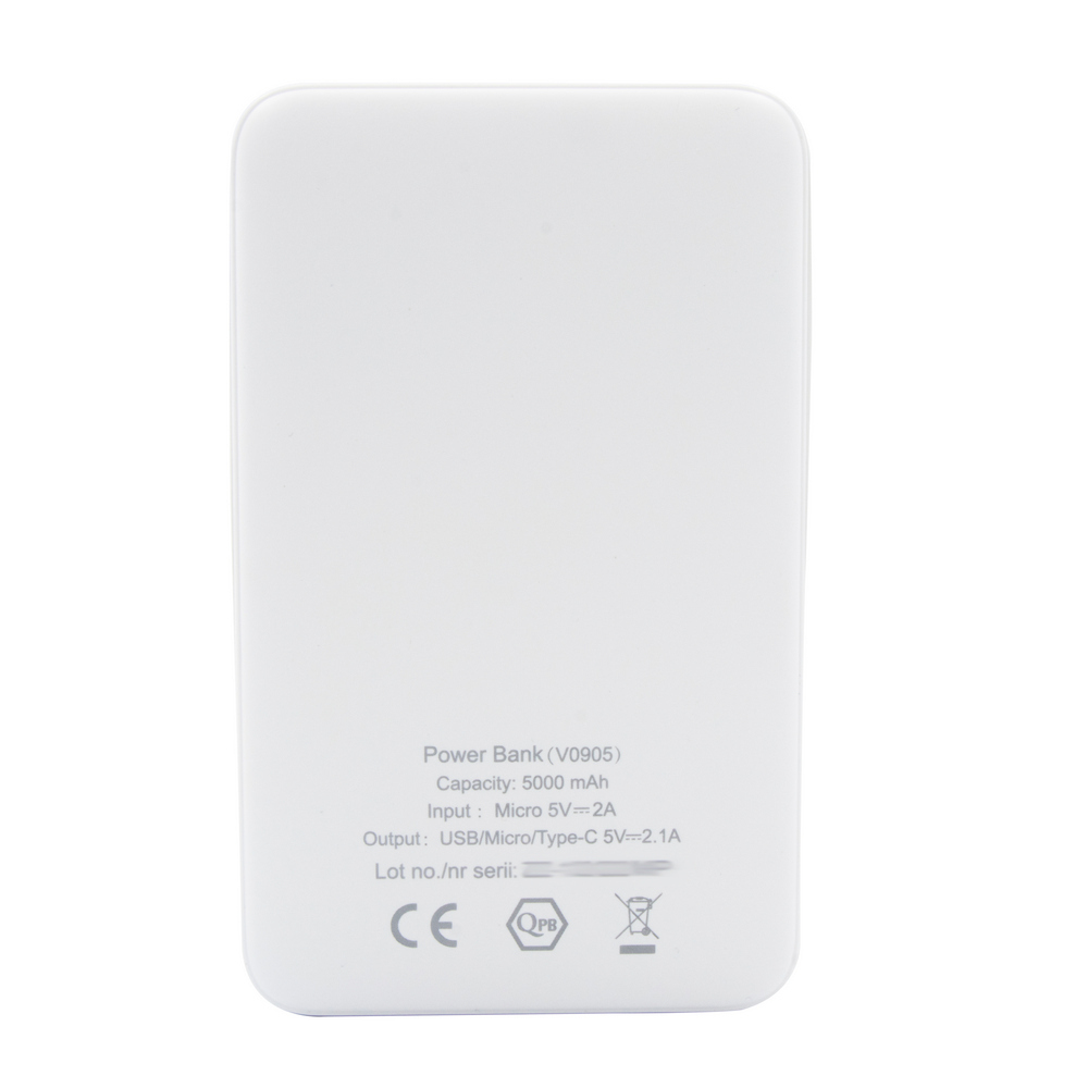 Power bank 5000 mAh z 2 zintegrowanymi kablami: USB typu C oraz micro USB, w komplecie adapter z wejściem micro USB i końcówką kompatybilną z urządzeniami iOS, 4 diody wskazujące poziom naładowania, wejście micro USB, kabel micro USB w komplecie