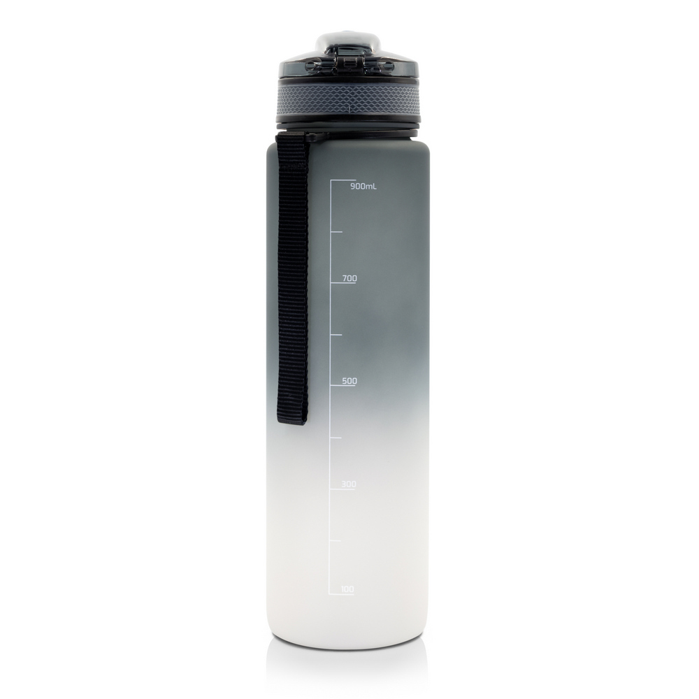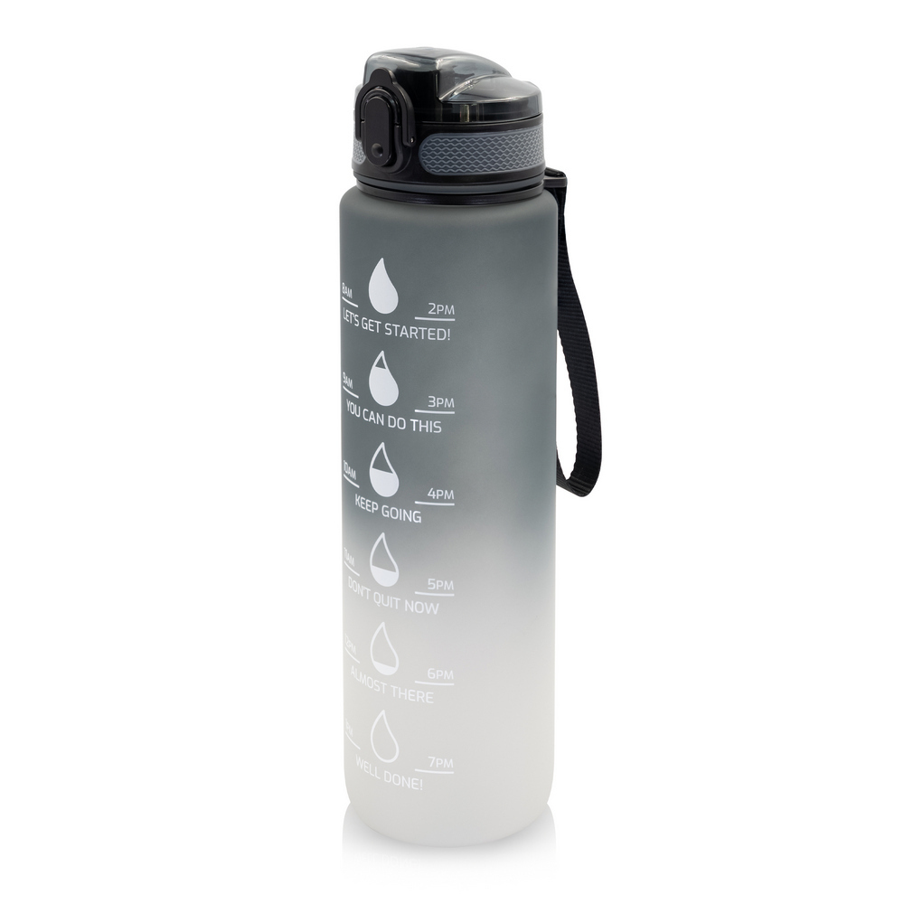 Butelka sportowa 1000 ml Air Gifts, skala ml z jednej strony i miarka motywacyjna z drugiej strony, zamknięcie z blokadą, pasek na rękę (pakowany oddzielnie), gumowane wykończenie, przeznaczona wyłącznie do zimnych i niegazowanych napojów