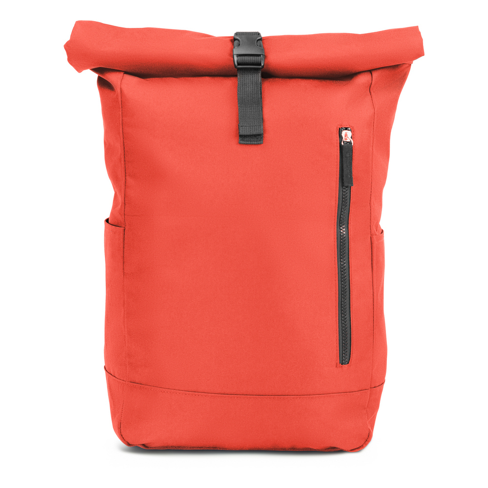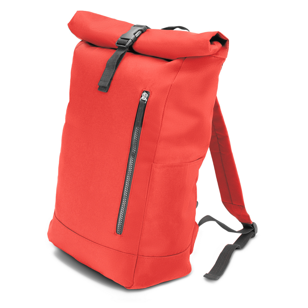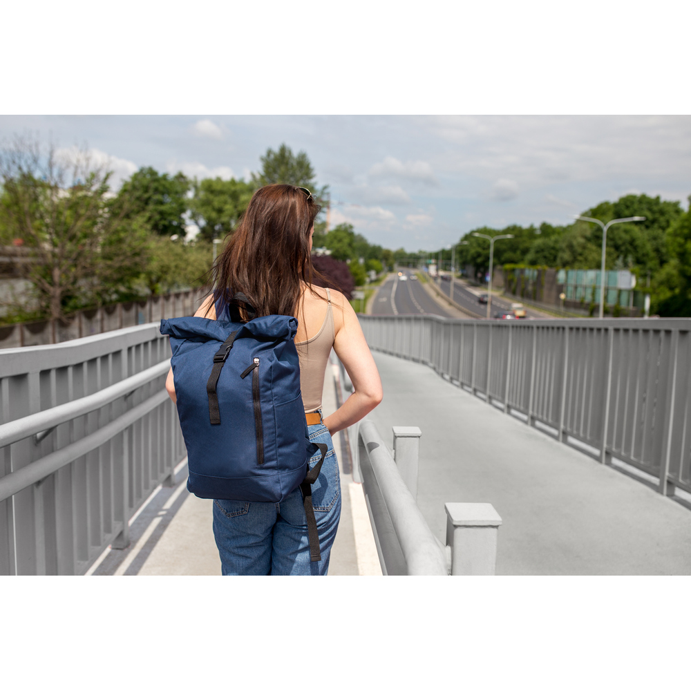 Plecak z przednią kieszenią i główną przegrodą na zamek błyskawiczny, wykonany z RPET, zgodny z certyfikatem GRS (Global RecycIed Standard), 2 kieszenie boczne, zwijana konstrukcja zamykana na klamrę, regulowane paski na ramię