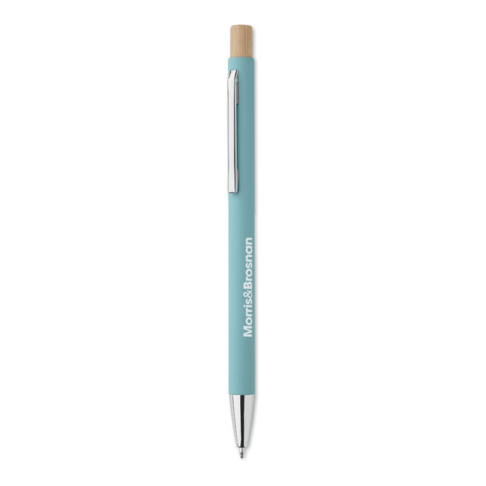 Aluminiowy długopis z recyklingu. Srebrna końcówka i klip. Niebieski tusz.