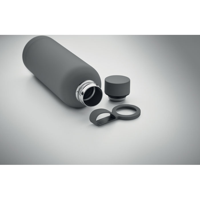 Dwuścienna butelka z izolacją próżniową z recyklingowanej stali nierdzewnej (90% z recyklingowanej stali nierdzewnej i 10% ze stali nierdzewnej) z gumowym wykończeniem i silikonowym uchwytem. Pojemność: 500 ml.