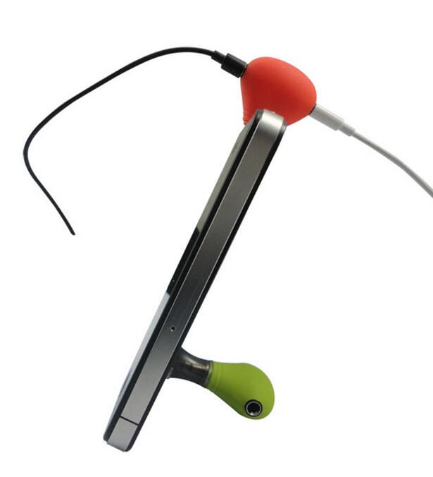 Przejściówka AUX do słuchawek. Służy jako rozgałęźnik, dzięki któremu do telefonu można podłączyć dwa zestawy słuchwek, a dzięki przyssawce może służyć też jako podstawka do telefonu.