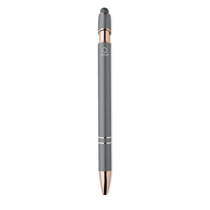 Długopis z recyklingowanego aluminium z detalami w kolorze różowego złota. Niebieski tusz.