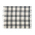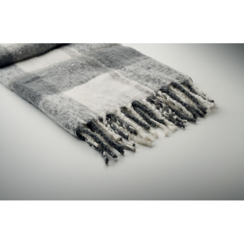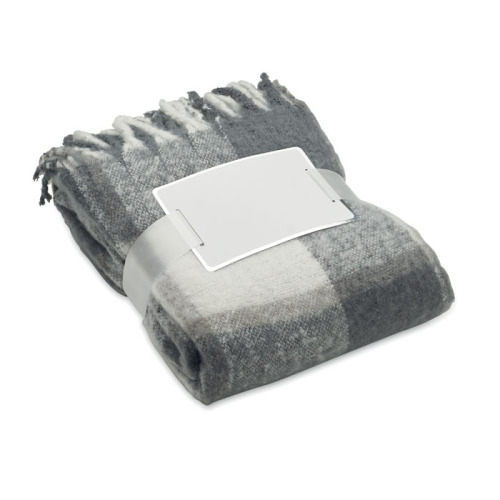 Poliestrowy koc w kratkę z ręcznie zawijanymi frędzlami. Owinięty wstążką i kartą z nadrukiem.