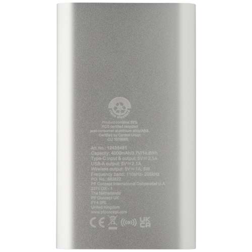 Juice bezprzewodowy powerbank o pojemności 4000 mAh Type-C z aluminium pochodzącego z recyklingu / Srebrny