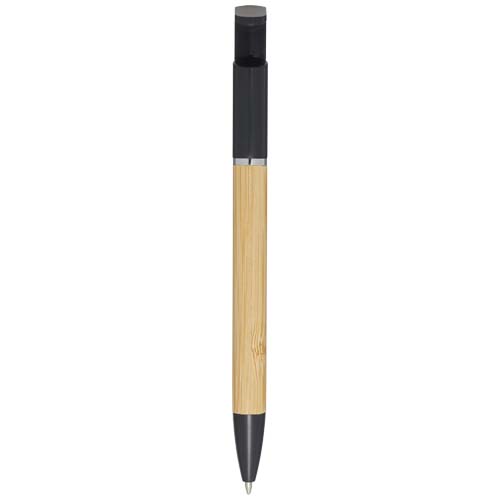 Bambusowy długopis, który pełni także funkcję uchwytu na telefon. Przycisk i środkowy pierścień wykonane są z tworzyw sztucznych pochodzących z recyklingu, końcówka z mosiądzu, a korpus z bambusa pozyskiwanego w sposób zrównoważony. Kolor tuszu: Czarny. Żywotność: 1000 metrów. Rozmiar stalówki: 1,0 mm.