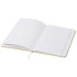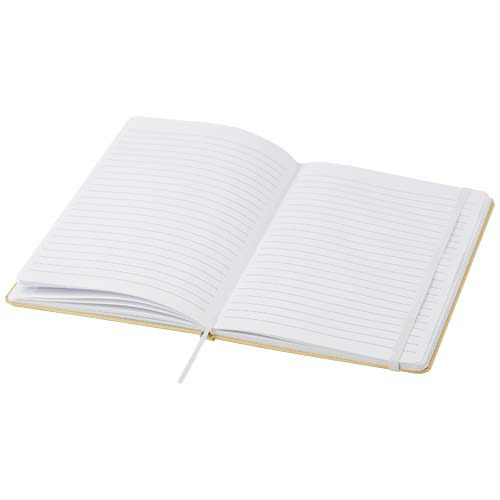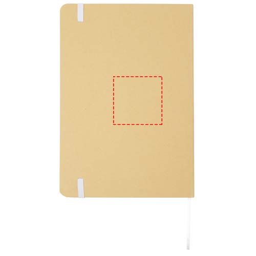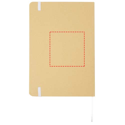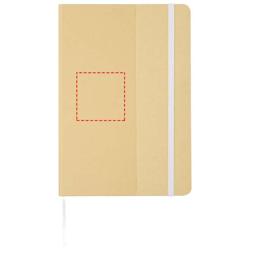 Notatnik A5 w twardej oprawie, wykonany z kartonu pochodzącego z recyklingu, zawierający 80 kartek w linie o gramaturze papieru 70 g/m². Notatnik posiada elastyczne zamknięcie, wstążkę i zaokrąglone rogi.