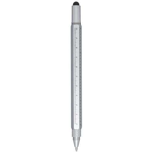 Dora aluminiowy wielofunkcyjny długopis wykonany częściowo z materiałów pochodzących z recyklingu, wyposażony w dwustronną linijkę, dźwignię, śrubokręt, podziałkę i czarny rysik wykonany z gumy. Korpus został wykonany z aluminium pochodzącego z recyklingu i pokryty srebrną powłoką natryskową. Klips wykonany jest z żelaza. Śrubokręt jest wykonany ze stali. Górna część i końcówka są wykonane z RABS. Kolor tuszu: Czarny. Żywotność: 400 metrów. Rozmiar stalówki: 1,0 mm.