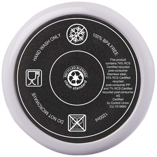 Melbourne kubek o trwałej konstrukcji z podwójnymi ściankami, dzięki czemu utrzymuje wysoką lub niską temperaturę napojów w każdym otoczeniu. Wewnętrzna ścianka kubka wykonana jest z tworzyw sztucznych pochodzących z recyklingu, a zewnętrzna ze stali nierdzewnej z certyfikatem RCS. Kubek ma pojemność 1200 ml, dzięki czemu zapewni Ci nawodnienie przez cały dzień w dobrym stylu. Posiada odporną na rozchlapywanie, wciskaną pokrywę z dwoma otworami i obrotowym zamknięciem. W zestawie słomka z recyklingu przeznaczona do kontaktu z żywnością. Tylko do mycia ręcznego.