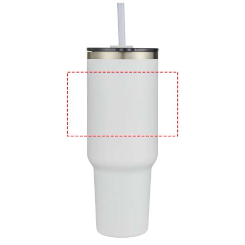Kubek z podwójnymi ściankami z miedzianą izolacją próżniową, posiadający certyfikat RCS, wykonany w 91% ze stali nierdzewnej pochodzącej z recyklingu, która utrzymuje niską temperaturę napojów przez co najmniej 24 godziny. Posiada słomkę Tritan i funkcję przesuwania pokrywki zapobiegającą rozlaniu płynu. Wykonana w 100% z tworzyw sztucznych pochodzących z recyklingu obrotowa pokrywka bezpiecznie utrzymuje słomkę na miejscu i można ją łatwo obrócić, aby odsłonić otwór na napój. Trwała zewnętrzna powłoka proszkowa. Pojemność: 1200 ml. Tylko do mycia ręcznego.
