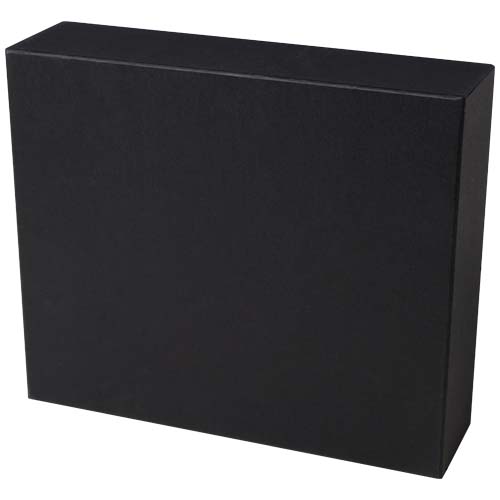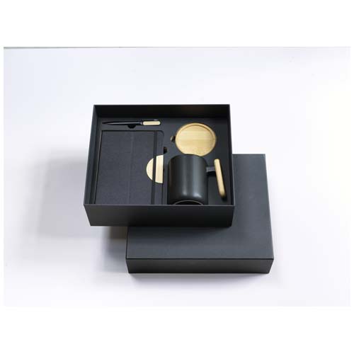 Laura zestaw upominkowy składający się z notatnika A5 RPET w twardej okładce, długopisu, kubka ceramicznego i podkładki. Notatnik ma czarne elastyczne zamknięcie i tasiemkową zakładkę oraz 80 kremowych kartek w linie z papieru o gramaturze 80 g/m². Okładka notesu wraz z bambusowym półkolem pełni funkcję stojaka na telefon. Długopis wykonany z aluminium pochodzącego z recyklingu z certyfikatem RCS i pokryty czarną powłoką w sprayu, z bambusowymi akcesoriami po obu stronach górnej części korpusu. Tusz długopisu: Czarny. Żywotność: 400 metrów. Ceramiczny kubek o pojemności 480 ml jest dostarczany z bambusową podstawką. Myć tylko ręcznie. Wymiary kubka: 11 x 12,7 cm. Średnica podkładki: 9,5 cm. Wymiary pudełka upominkowego: 32 x 27 x 10,3 cm.