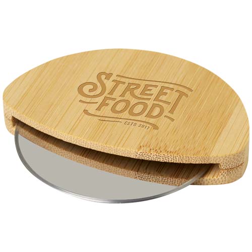 Przyrząd do krojenia pizzy z bambusowym uchwytem i ostrzem ze stali nierdzewnej.
