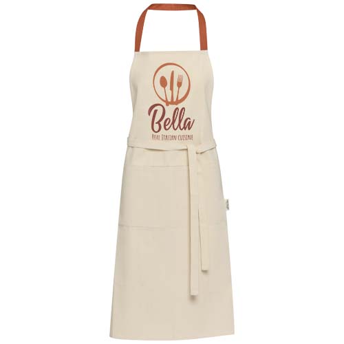 Nia fartuch wykonany w 100% z bawełny pochodzącej z recyklingu o gramaturze 200 g/m² z certyfikatem GRS. Dzięki naturalnemu kolorowi bawełny i kontrastowej pętli na szyję, fartuch ten ochroni Twoje ubrania podczas gotowania. Nia fartuch z dwoma przylegającymi do siebie kieszeniami o łącznych wymiarach 45 x 20 cm i wiązaniu z tyłu o długości 1 metra zapewnia jest zarówno praktyczny, jak i stylowy podczas pracy w kuchni.