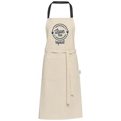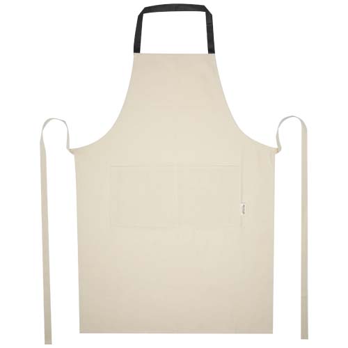 Nia fartuch wykonany w 100% z bawełny pochodzącej z recyklingu o gramaturze 200 g/m² z certyfikatem GRS. Dzięki naturalnemu kolorowi bawełny i kontrastowej pętli na szyję, fartuch ten ochroni Twoje ubrania podczas gotowania. Nia fartuch z dwoma przylegającymi do siebie kieszeniami o łącznych wymiarach 45 x 20 cm i wiązaniu z tyłu o długości 1 metra zapewnia jest zarówno praktyczny, jak i stylowy podczas pracy w kuchni.