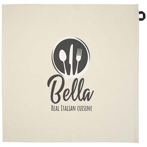 Ręcznik kuchenny wykonany w 100% z bawełny pochodzącej z recyklingu o gramaturze 200 g/m² z certyfikatem GRS, z charakterystyczną kontrastową pętelką. Wymiary ręcznika: 50 x 50 cm.