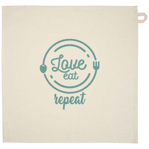 Ręcznik kuchenny wykonany w 100% z bawełny pochodzącej z recyklingu o gramaturze 200 g/m² z certyfikatem GRS, z charakterystyczną kontrastową pętelką. Wymiary ręcznika: 50 x 50 cm.