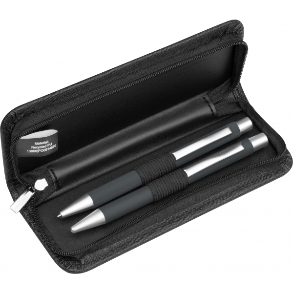 Elegancki zestaw piśmienny składający się z długopisu piszącego na niebiesko oraz dopasowanego ołówka automatycznego to idealny wybór dla osób ceniących styl i funkcjonalność. Oba narzędzia piśmiennicze wyróżniają się srebrnymi elementami dekorującymi oraz miękką w dotyku powłoką typu soft touch, zapewniając komfort podczas pisania. Zestaw zapakowany jest w minimalistyczne etui wykonane z PU, zamykane na zamek, co zapewnia ochronę i elegancki wygląd. To doskonały pomysł na prezent biznesowy i konferencyjny.