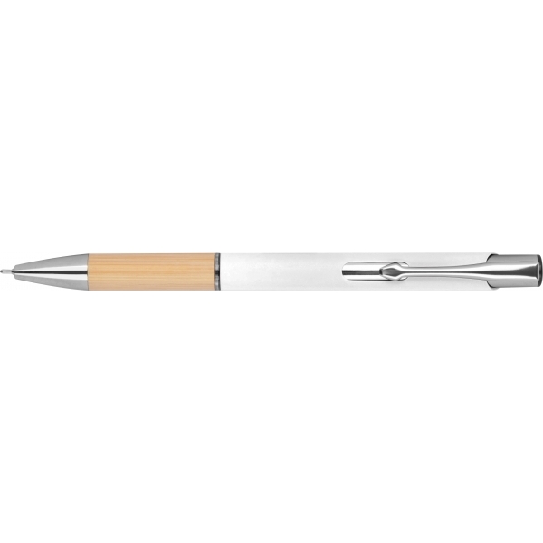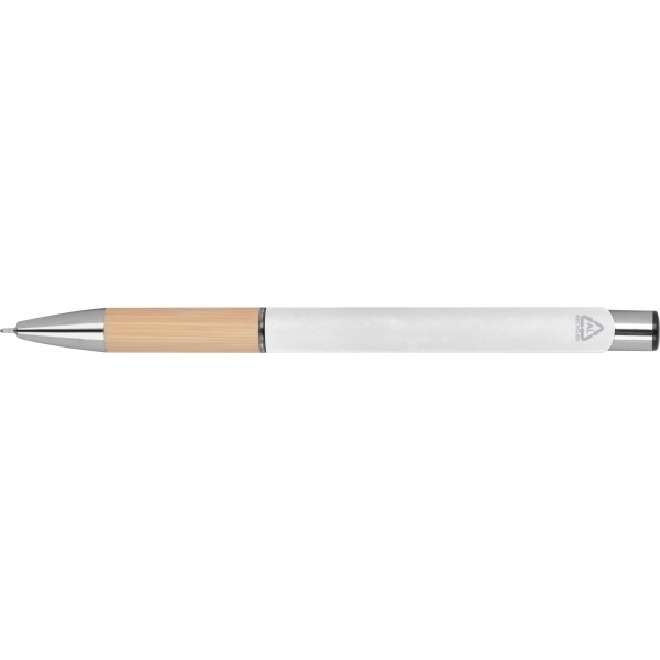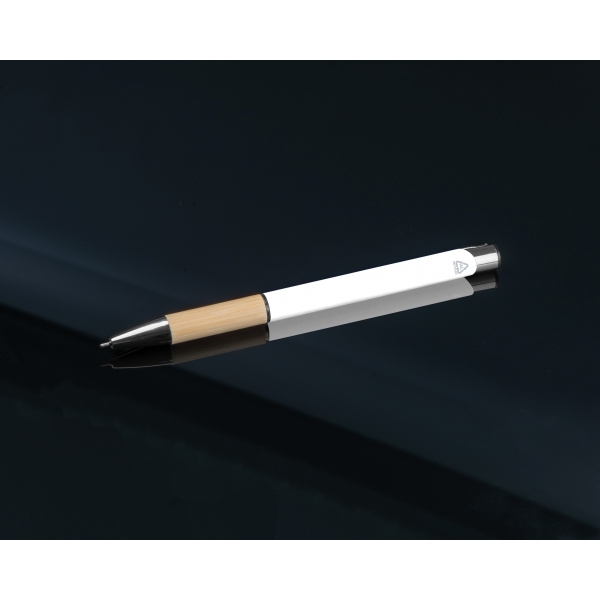 Długopis wykonany z aluminium pochodzącego z recyklingu ze srebrnymi elementami. Dzięki półżelowemu wkładowi, długopis ten pisze płynnie i lekko, co sprawdzi się dla wszystkich tych osób, które poszukują eleganckiej alternatywy dla klasycznych, tuszowych długopisów. Długopis ten charakteryzuje się solidną konstrukcją – jest dobrze wyważony w dłoni, z niebieskim wkładem i stylowym, bambusowym uchwytem, nadającym mu unikatowy wygląd. Przy przycisku znajduje się również sygnowany znacznikiem recyklingu. Korpus długopisu jest matowy, a powłoka gładka, przyjemna w dotyku.