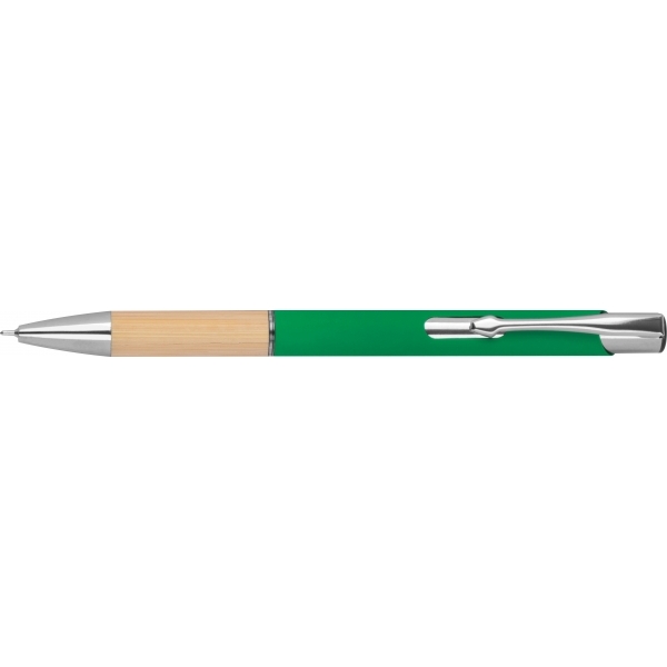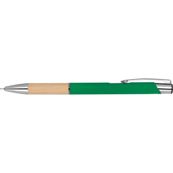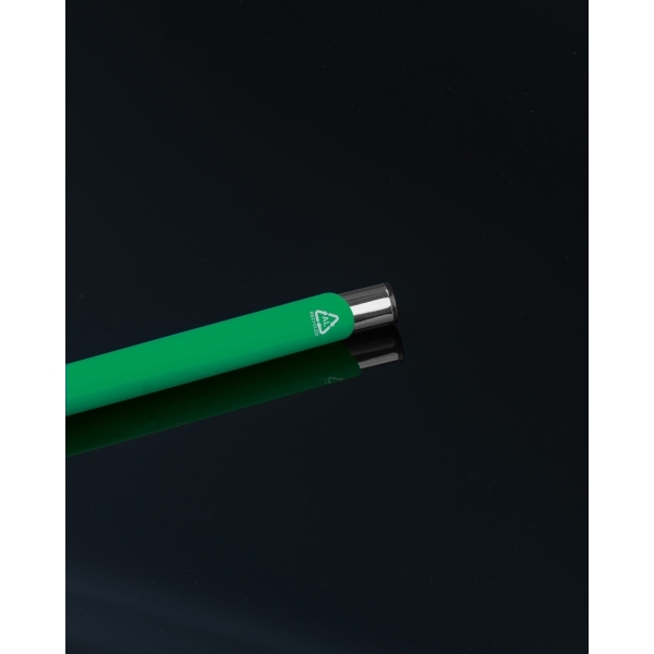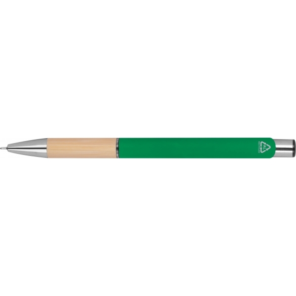 Długopis wykonany z aluminium pochodzącego z recyklingu ze srebrnymi elementami. Dzięki półżelowemu wkładowi, długopis ten pisze płynnie i lekko, co sprawdzi się dla wszystkich tych osób, które poszukują eleganckiej alternatywy dla klasycznych, tuszowych długopisów. Długopis ten charakteryzuje się solidną konstrukcją – jest dobrze wyważony w dłoni, z niebieskim wkładem i stylowym, bambusowym uchwytem, nadającym mu unikatowy wygląd. Przy przycisku znajduje się również sygnowany znacznikiem recyklingu. Korpus długopisu jest matowy, a powłoka gładka, przyjemna w dotyku.