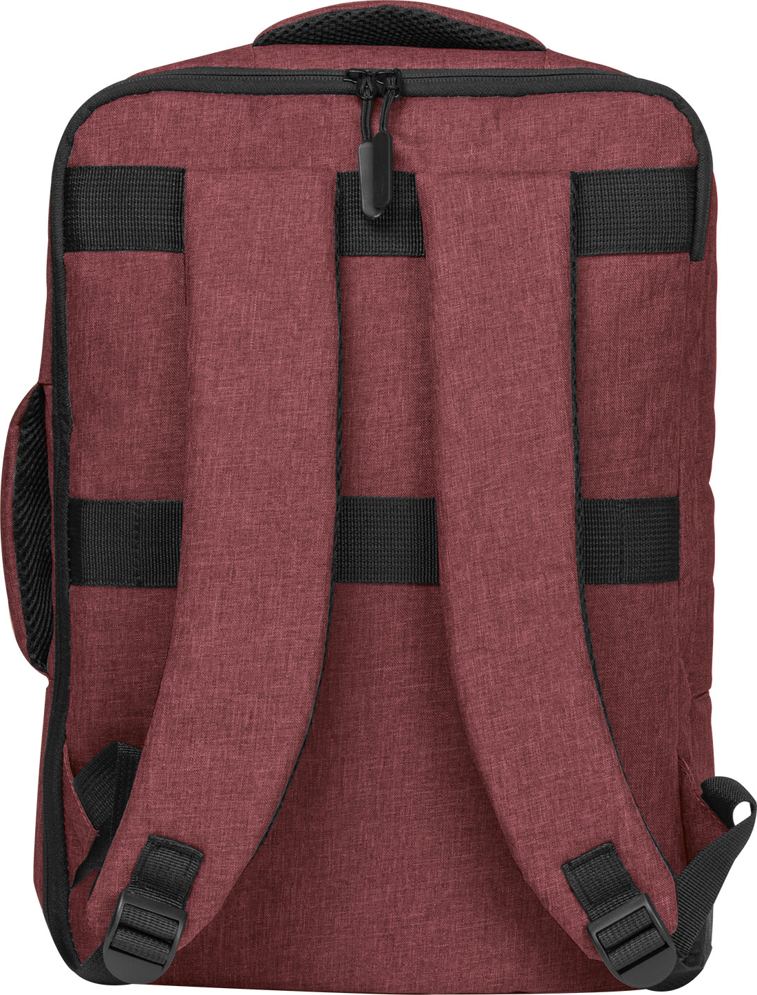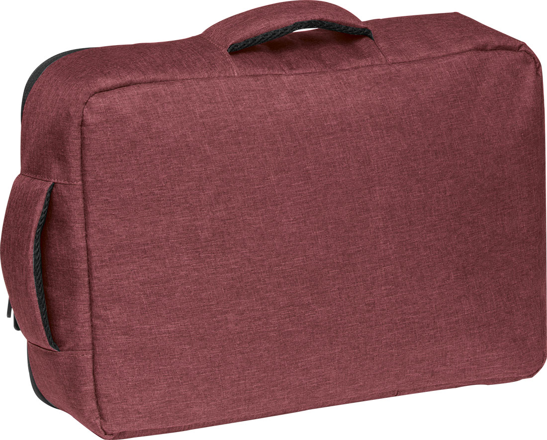 Plecak wykonany z poliestru, z innowacyjnym designem. Plecak posiada dyskretne, watowane uchwyty do ręcznego przenoszenia w pionie i w poziomie, dzięki czemu gadżet ten może służyć zarówno jako plecak noszony klasycznie na watowanych szelkach, albo jako otwierana walizka. Wewnątrz znajdują się dwie praktyczne kieszonki, idealne do przenoszenia drobiazgów, takich jak klucze, pomadka, kabelki elektroniczne itp. oraz dwie materiałowe pętelki na długopisy. We wnętrzu plecaka uwzględniono także dedykowaną kieszeń na laptopa, zabezpieczoną piankowym wzmocnieniem z obu stron (zarówno na plecach walizki, jak i na kieszeni). Dodatkowym atutem plecaka jest uchwyt na tyle, nadający się do podróży samolotem. Dzięki niemu walizkę można zaczepić bezpiecznie o rączkę bagażu podręcznego lub umieścić na wózku bagażowym bez obawy jej zsunięcia się z platformy.