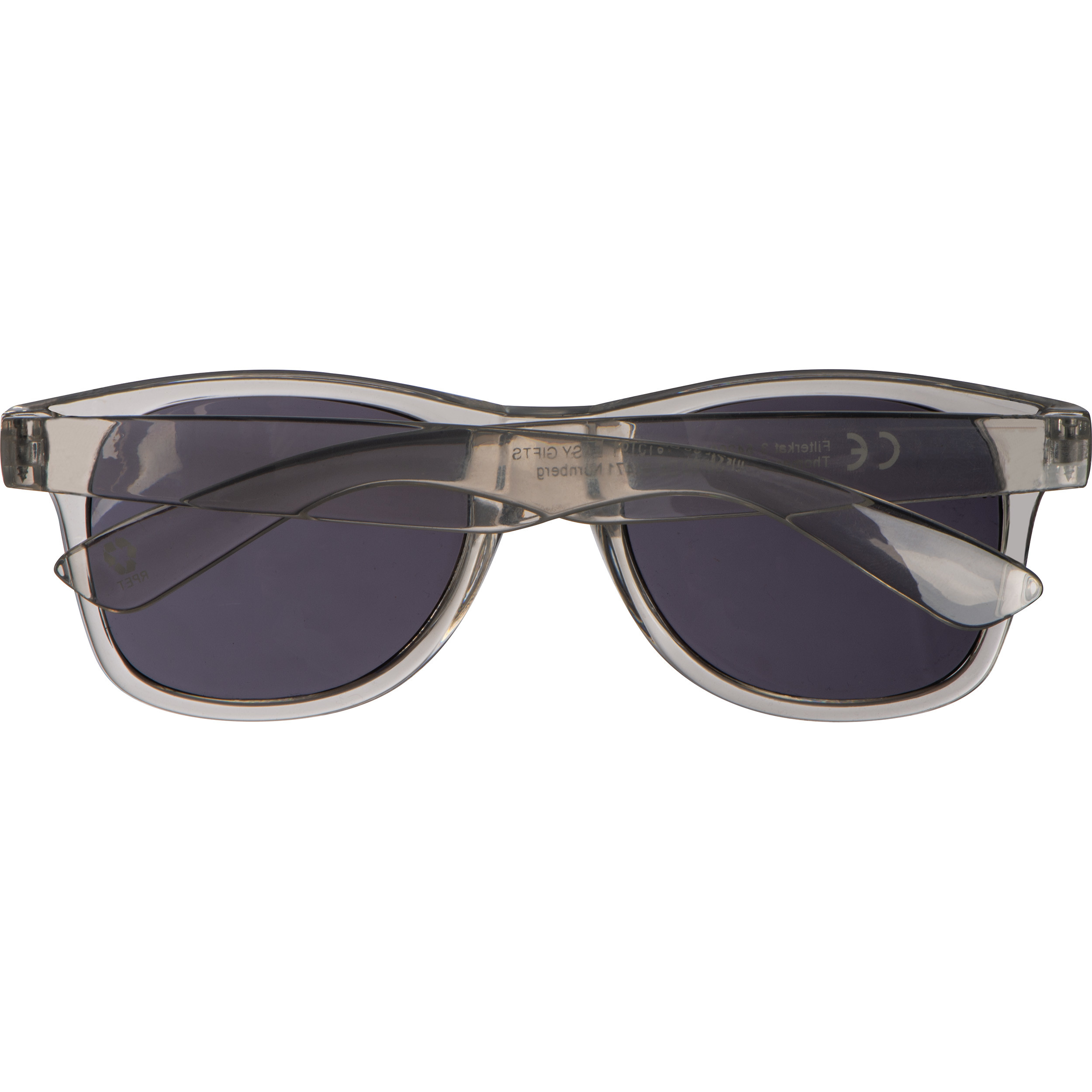 Okulary z materiału z recyklingu o uniwersalnym kształcie. Ich głównym atutem jest wytrzymałość i prosty wygląd. Gadżet ten idealnie sprawdzi się dla osób poszukujących klasycznych akcesoriów, które powstają jako ponowne zużycie materiałów i tym samym zmniejszają negatywny wpływ na środowisko. Oprawki wykonane są z estetycznego materiału RPET, dzięki temu są one lekkie, wygodne w noszeniu i trwałe. Soczewki skutecznie chronią oczy przed szkodliwym promieniowaniem słonecznym. Te okulary to sprawdzony gadżet letni w bardziej ekologicznej odsłonie, który posiada ikonkę RPET na wewnętrznej stronie ucha. Idealny upominek na codzienne użytkowanie, spacer po plaży, czy weekendowy wypad za miasto.