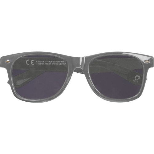 Okulary z materiału z recyklingu o uniwersalnym kształcie. Ich głównym atutem jest wytrzymałość i prosty wygląd. Gadżet ten idealnie sprawdzi się dla osób poszukujących klasycznych akcesoriów, które powstają jako ponowne zużycie materiałów i tym samym zmniejszają negatywny wpływ na środowisko. Oprawki wykonane są z estetycznego materiału RPET, dzięki temu są one lekkie, wygodne w noszeniu i trwałe. Soczewki skutecznie chronią oczy przed szkodliwym promieniowaniem słonecznym. Te okulary to sprawdzony gadżet letni w bardziej ekologicznej odsłonie, który posiada ikonkę RPET na wewnętrznej stronie ucha. Idealny upominek na codzienne użytkowanie, spacer po plaży, czy weekendowy wypad za miasto. Cechy ogólne:Soczewki z akrylu z ochroną UV400, kategoria 3.