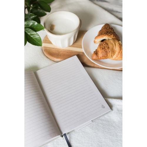 Notatnik B'RIGHT w formacie ok. A5, posiada 80 kartek w linie (160 stron), tasiemka zakładkowa umożliwia wygodne zaznaczanie ostatniej strony lub ważniejszych notatek, twarda okładka wykonana z bawełny z recyklingu, kartki z papieru z recyklingu