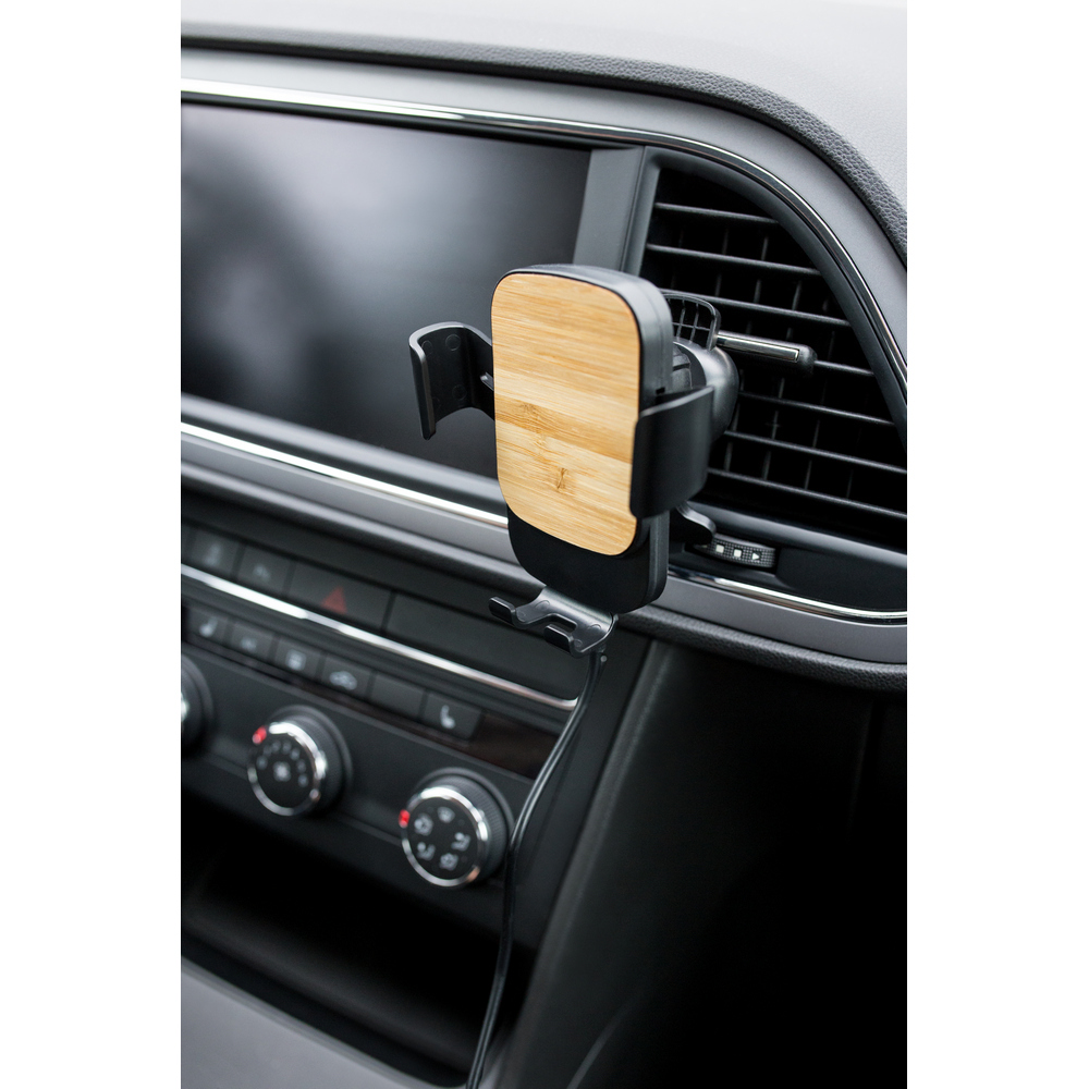 Grawitacyjny samochodowy uchwyt do telefonu z bambusowym elementem, ładowarka bezprzewodowa 15W, działa z telefonami posiadającymi możliwość ładowania indukcyjnego, mocowanie do wentylacji, wejście USB-C, 100 cm kabel USB-C w komplecie, produkt wykonany z ABS i bambusa