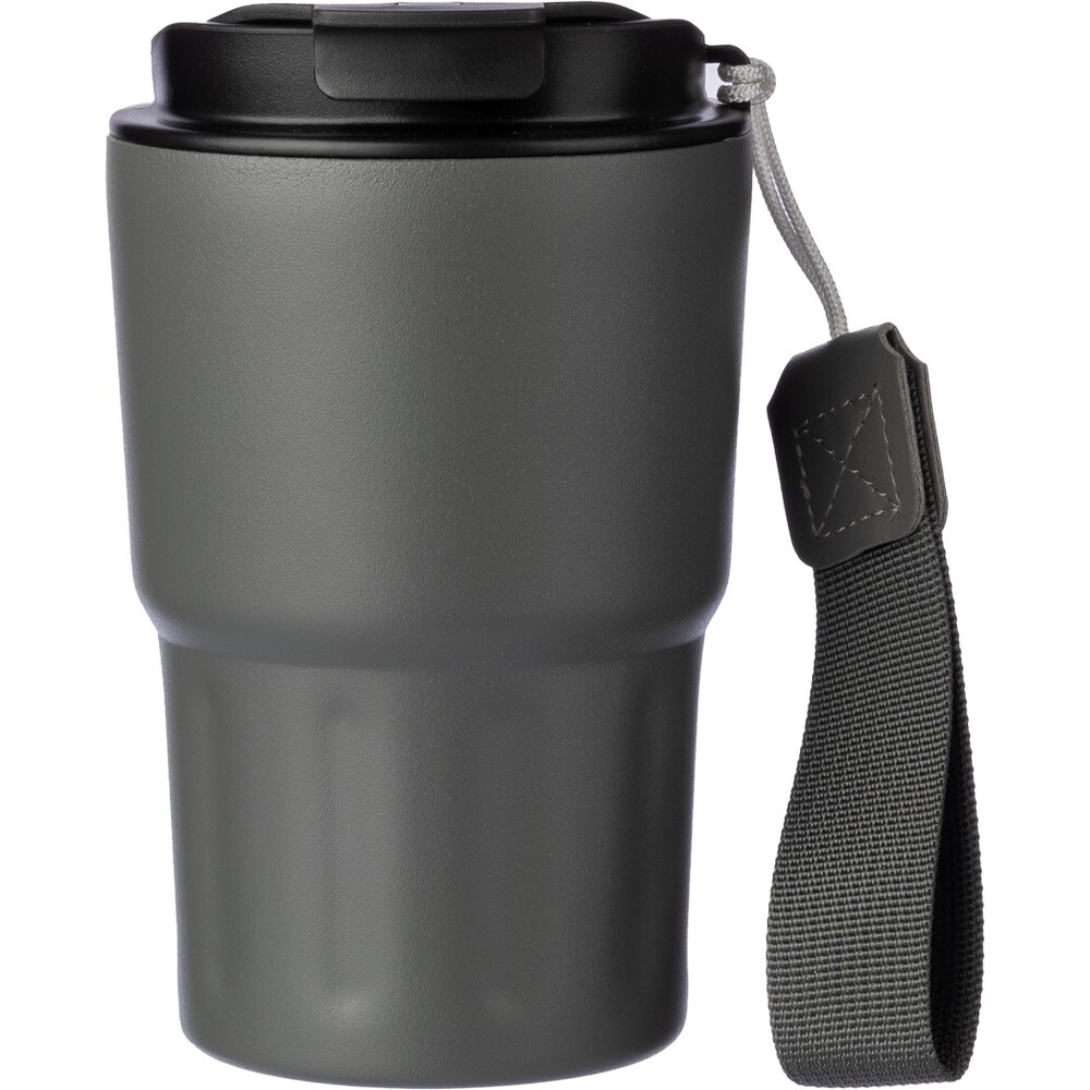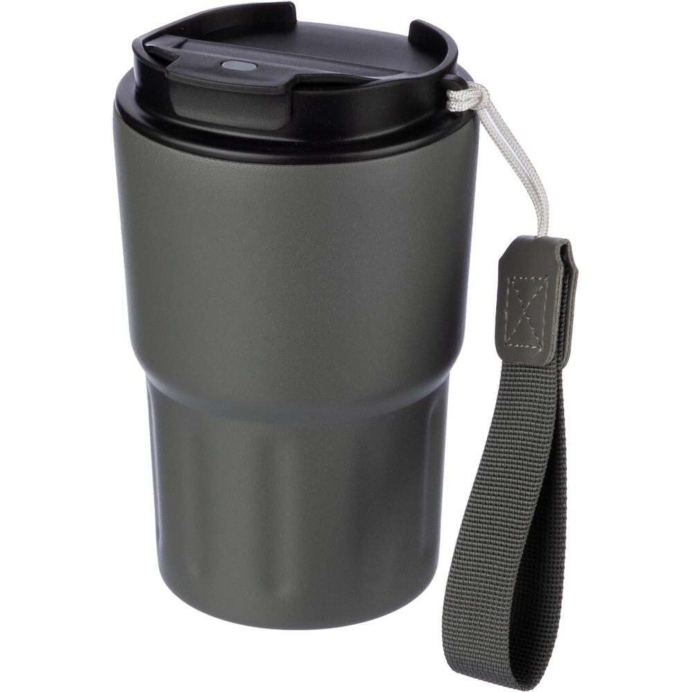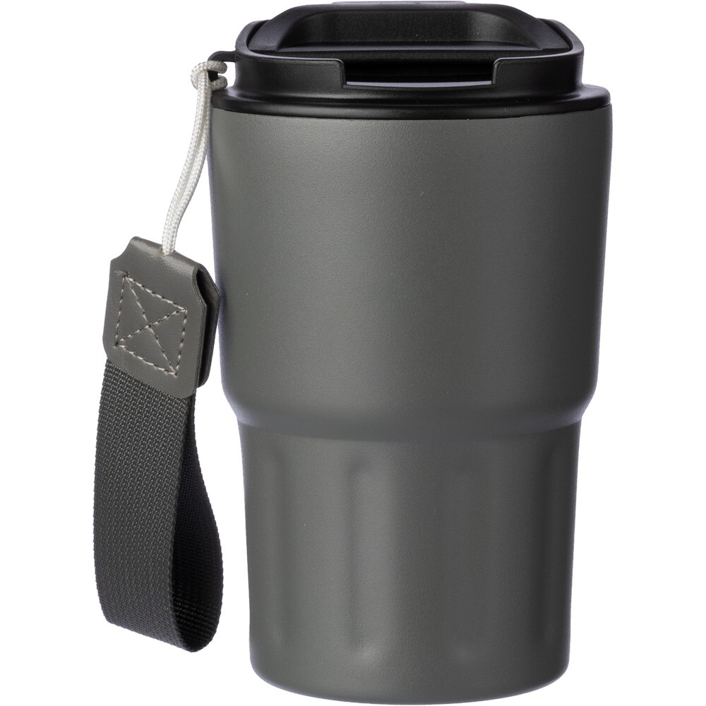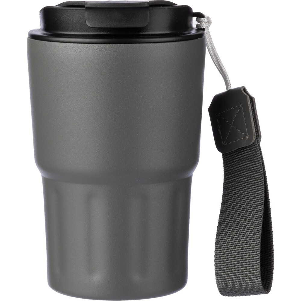Kubek termiczny 320 ml, posiada podwójne ścianki ze stali nierdzewnej z próżnią między ściankami, co spowalnia oddawanie temperatury na zewnątrz, zachowując funkcje termosu, pasek ułatwiający noszenie lub przypięcie, plastikowe wieczko z otwarciem umożliwiającym łatwą obsługę jedną ręką, dobrze trzyma temperaturę ciepłych i zimnych napojów