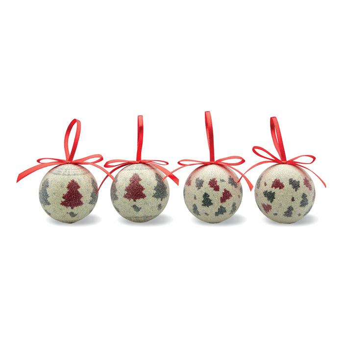 Zestaw 4 bombek świątecznych z uchwytami z czerownej wstążki, pakowane w ozdobny kartonik.