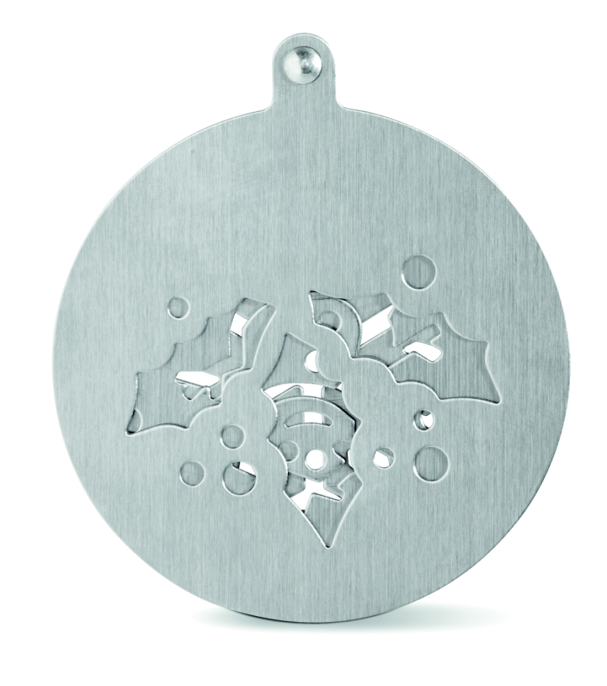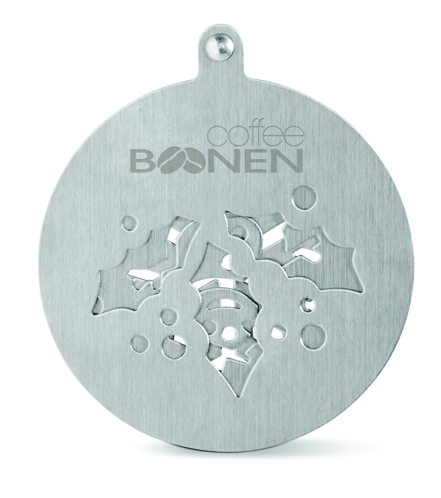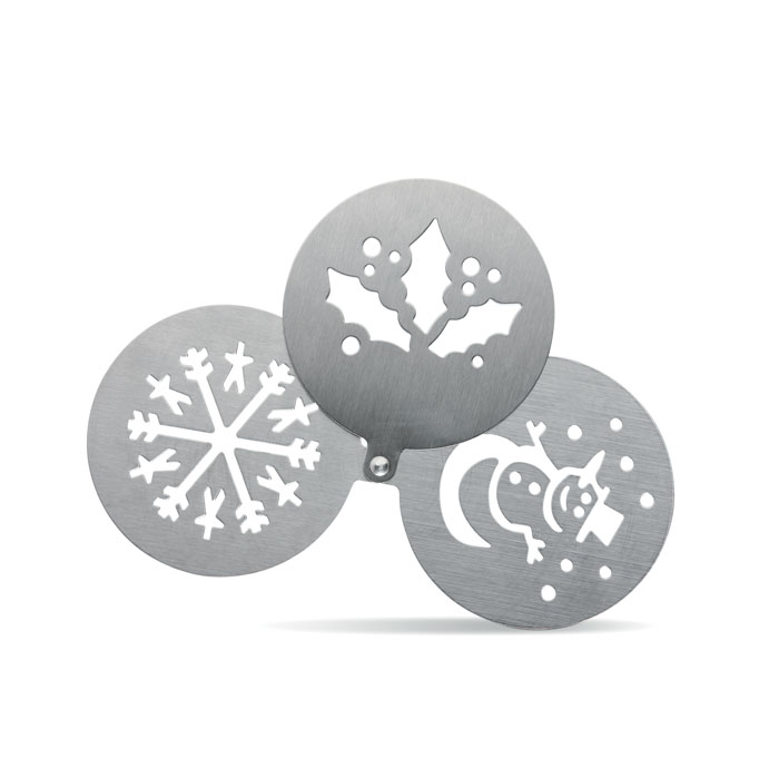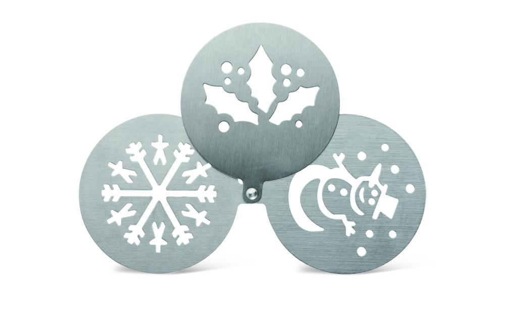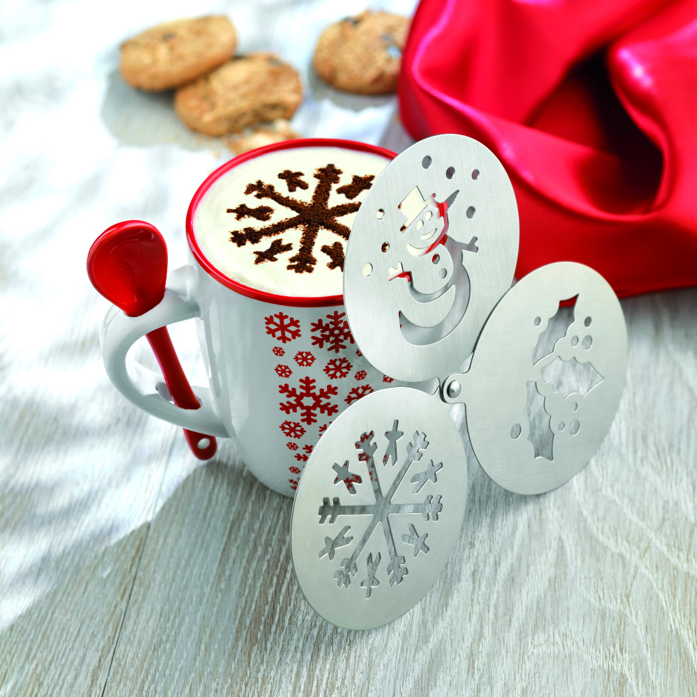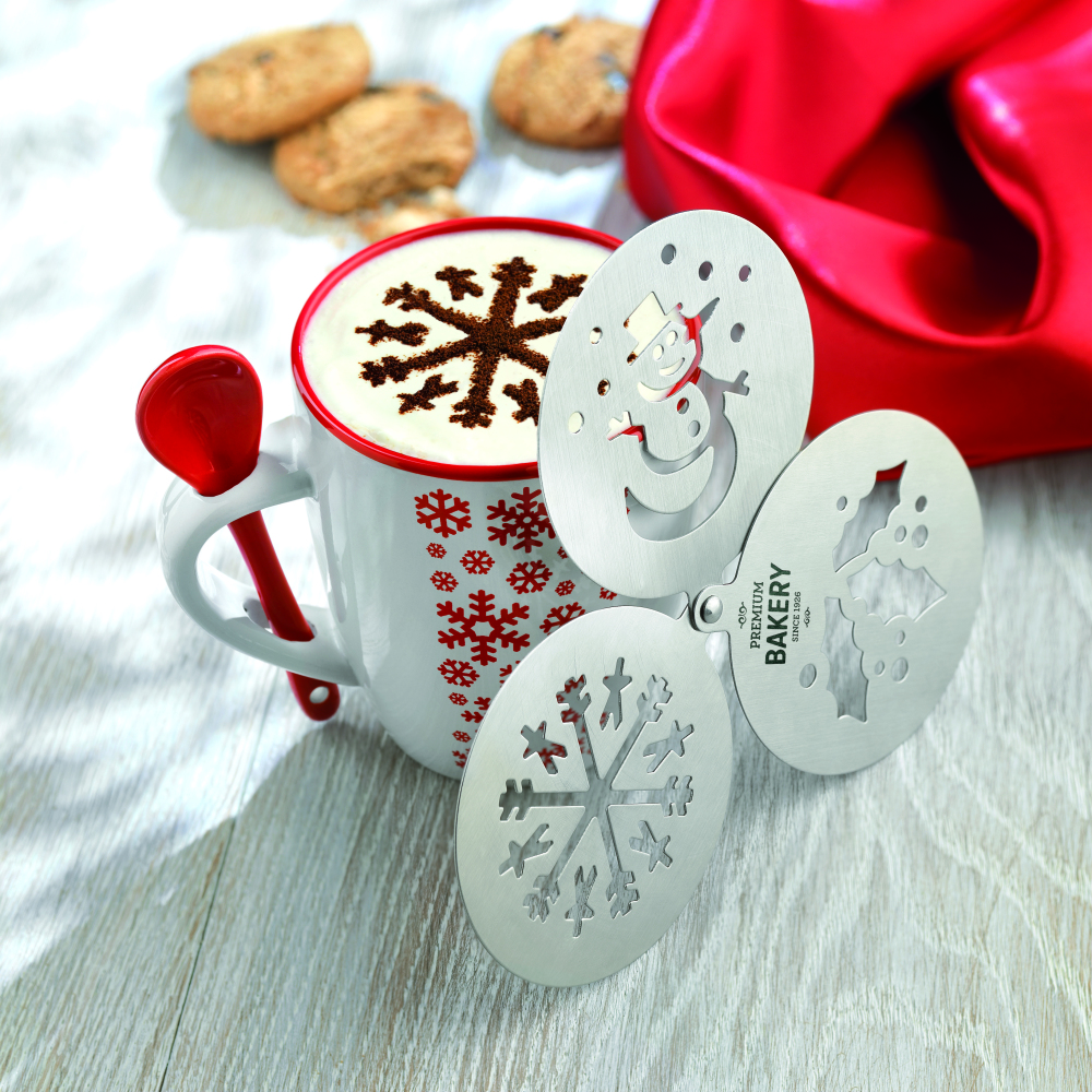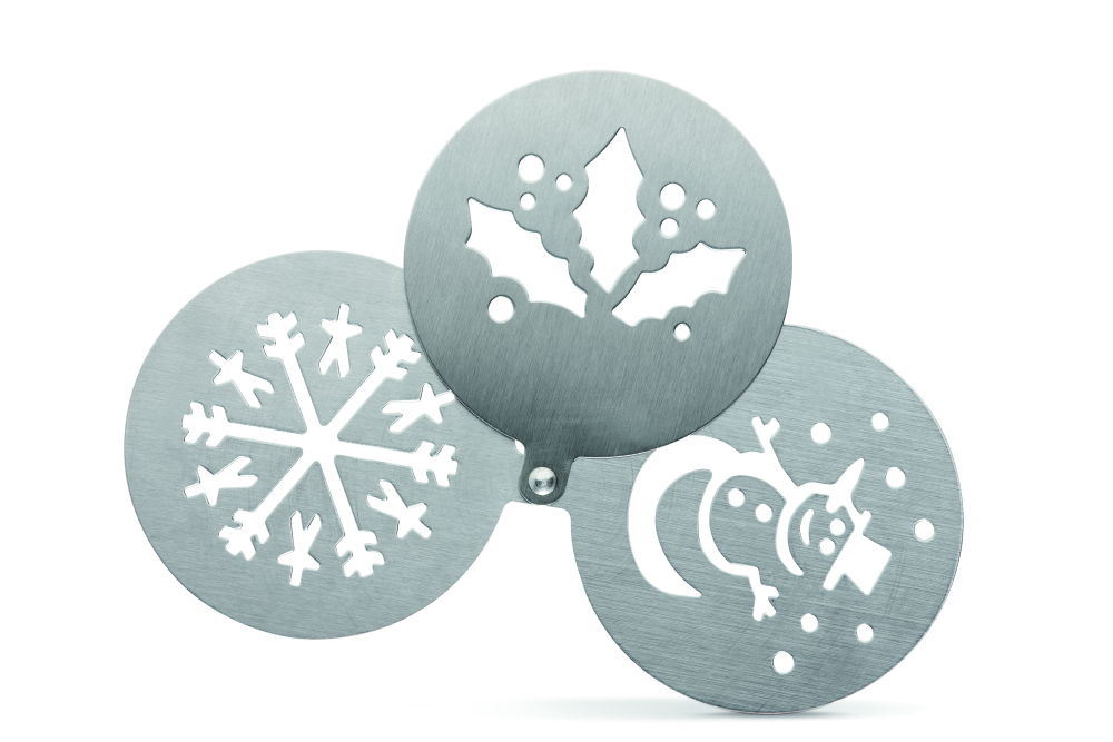 Metalowy szablon ze świątecznymi wzorami do zdobienia kawy.