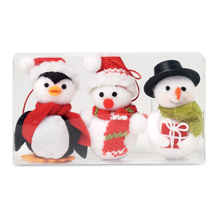 Zestaw 3 świątecznych zawieszek w kształcie zabawnych bałwanków, wykonanych z filcu oraz pianki. Zapakowany w pudełko z PVC.