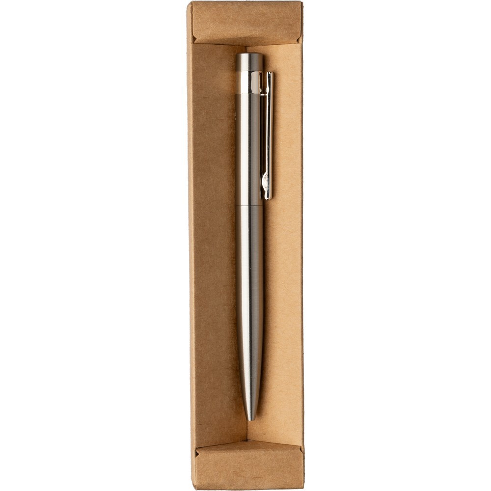 Długopis przekręcany, posiada wkład w niebieskim kolorze, ikona stali nierdzewnej z recyklingu na produkcie, zapakowany w pudełko prezentowe z papieru kraftowego, produkt wykonany ze stali nierdzewnej z recyklingu