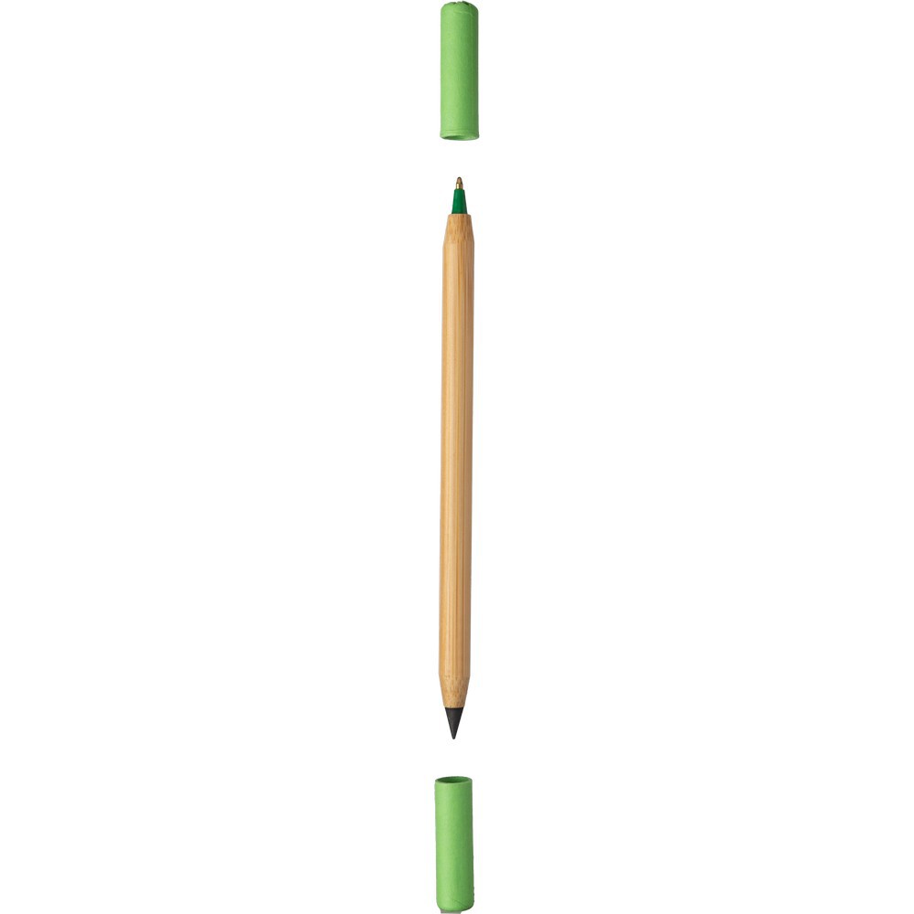 "Wieczny" ołówek i długopis w jednym, wolnościerająca się końcówka ołówka powoduje jego dłuższe zużycie, posiada dwie kolorowe zatyczki z kartonu, produkt wykonany z bambusa