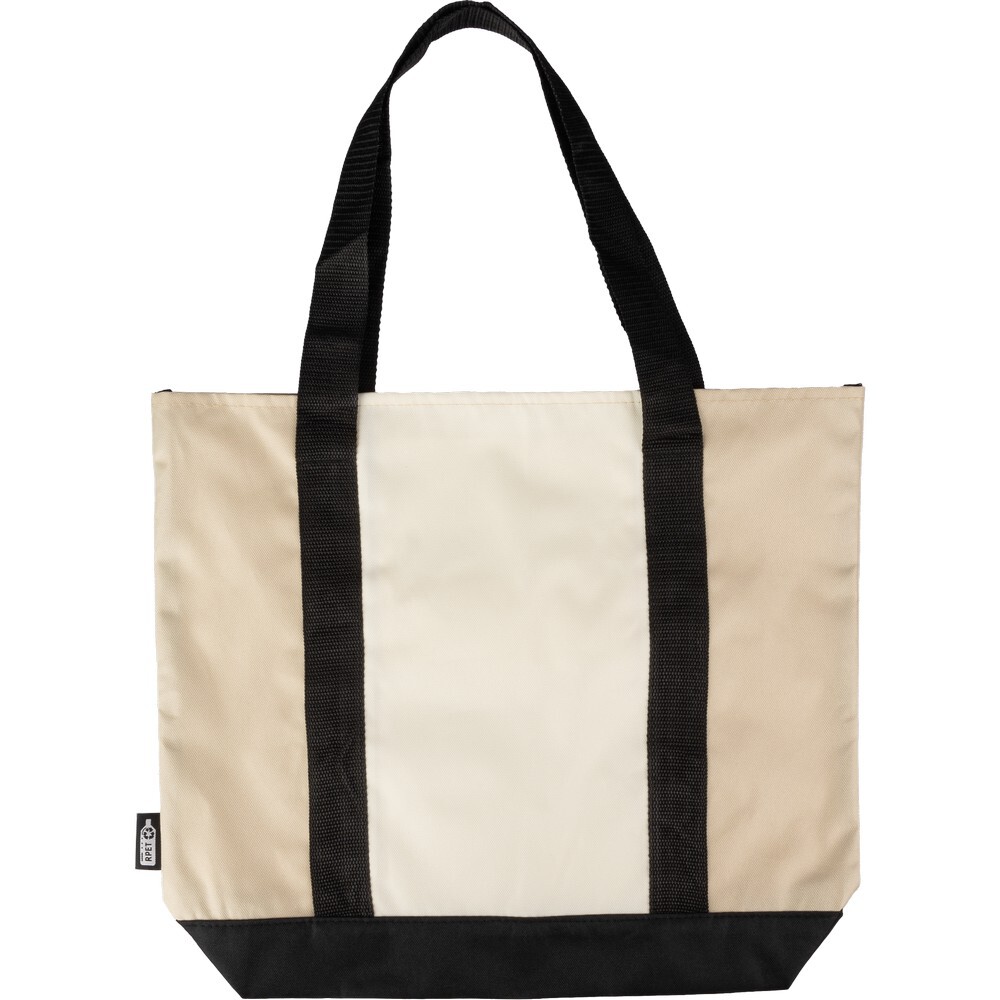 Torba na zakupy, posiada długie uchwyty umożliwiające noszenie na ramieniu, duża przegroda zapinana na zamek, otwarta kieszeń przednia, produkt wykonany z RPET