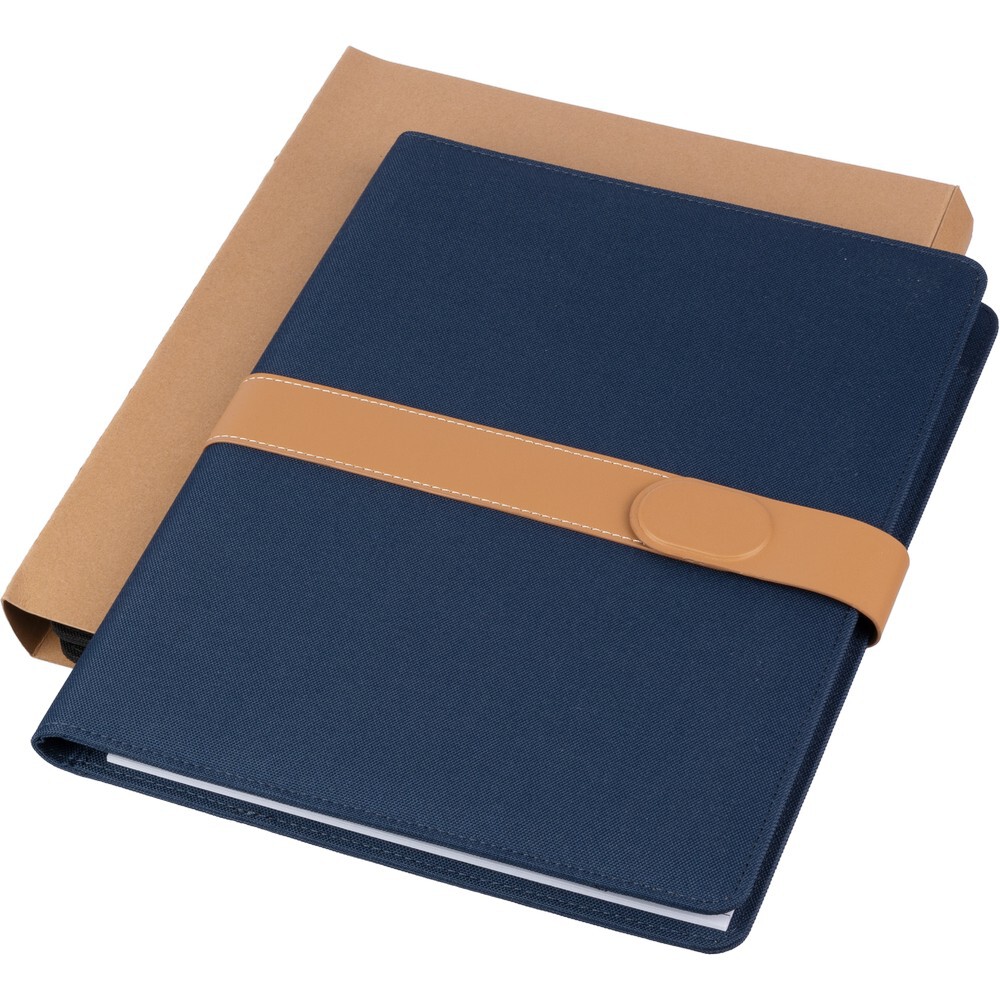 Teczka konferencyjna w formacie ok. A4, zawiera notatnik z 20 kartkami w linie, przegródki na dokumenty i pętelkę na długopis, zamknięcie magnetyczne, pakowany pojedynczo w kraftowy rękaw, produkt wykonany z RPET