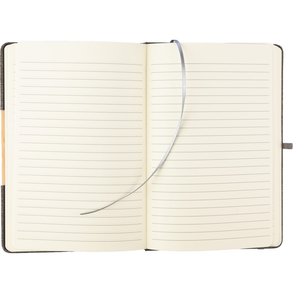 Notatnik ok. A5, posiada 80 stron w linie, tasiemka zakładkowa umożliwia wygodne zaznaczanie ostatniej strony lub ważniejszych notatek, dodatkowe zamknięcie w postaci dopasowanej kolorystycznie elastycznej opaski, składana okładka z bambusowym elementem zmienia się w stojak na telefon, zmieści się do szkolnego plecaka, produkt wykonany z RPET