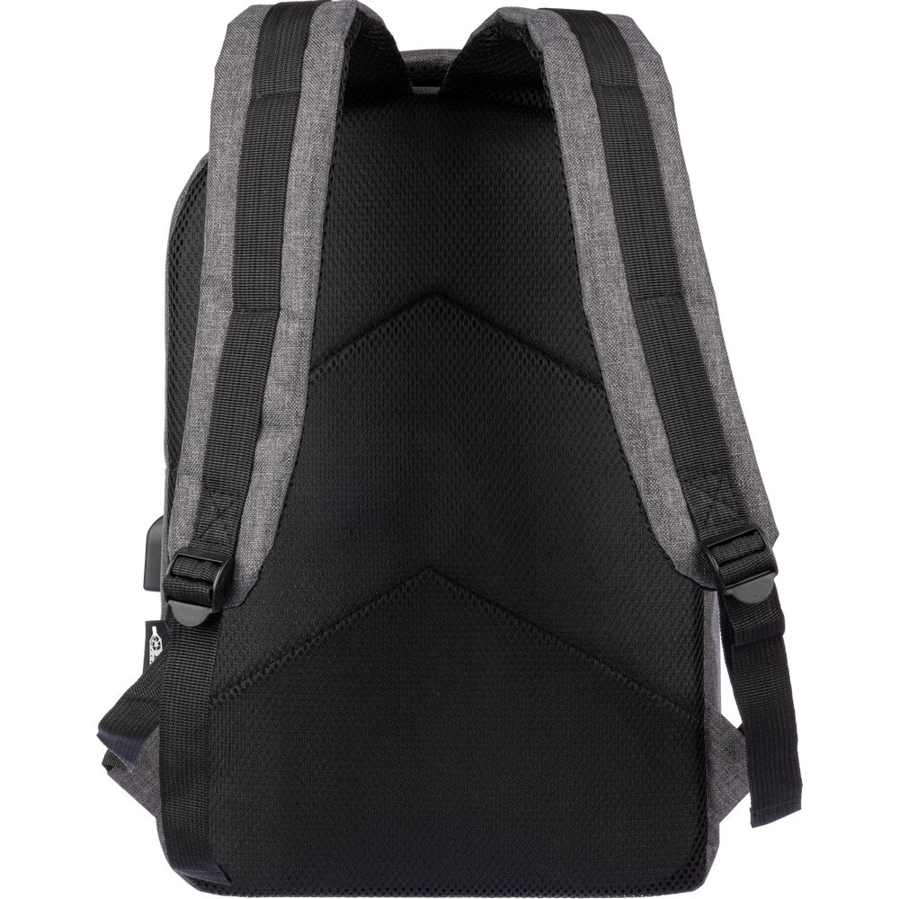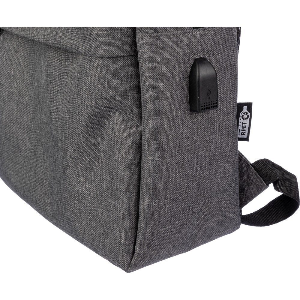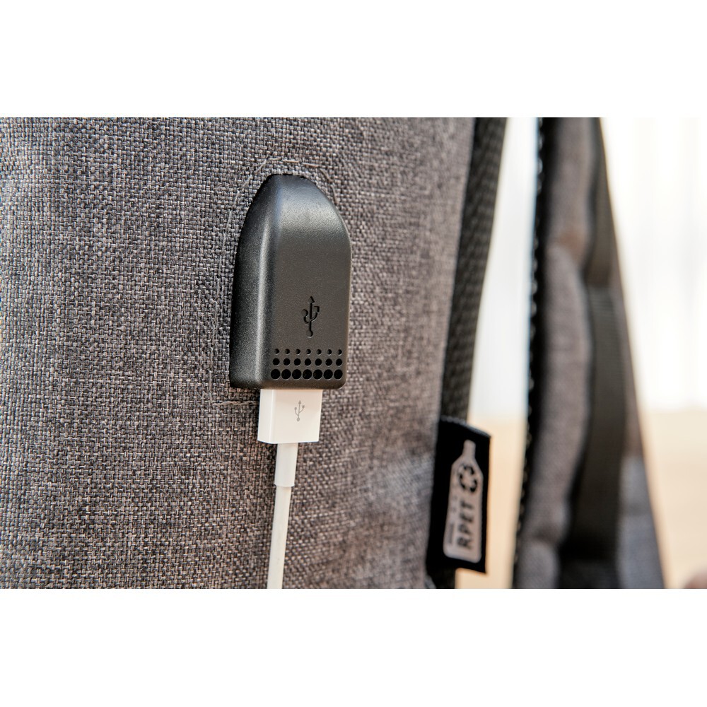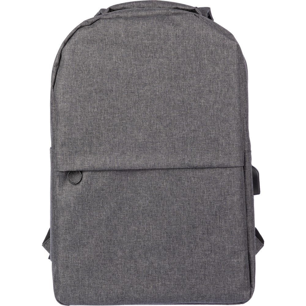 Plecak na laptopa 15", wewnątrz plecaka znajduje się port USB z kablem w środku do ładowania urządzeń, duża kieszeń zamykana na zamek, kieszeń przednia zamykana na zamek, wewnętrzna przegroda na urządzenia do 15", wewnętrzna przegroda na urządzenia do 10", regulowane paski na ramię, można w nim przenieść książki, laptopa oraz drobne zakupy lub przybory, produkt wykonany z RPET