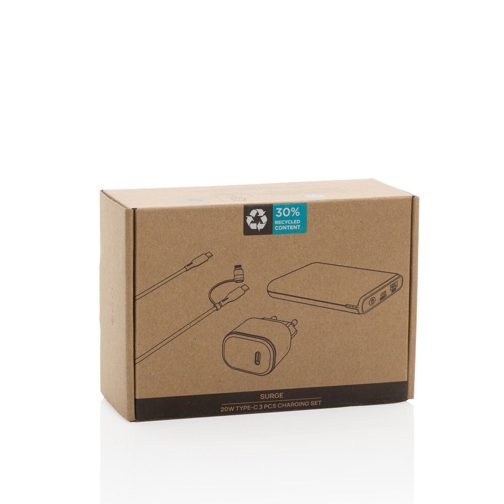 Zestaw do ładowania 3 w 1, ładowarka ścienna USB typu C 20W, power bank 5000 mAh, kabel do ładowania i synchronizacji danych 3 w 1 60W, końcówki: 2 x USB C, iOS, wykonane z ABS i TPE z recyklingu, wyjście ładowarki 5V/3A, 9V/2.22A, 12V/1.67A, 20W, wyjście power banku: 5V/2.4A, wejście 5V/2.4A, całkowita zawartość materiałów z recyklingu obliczona w oparciu o wagę całkowitą przedmiotu: 59%, pokrowiec RPET w komplecie, w pudełku z certyfikatem FSC®