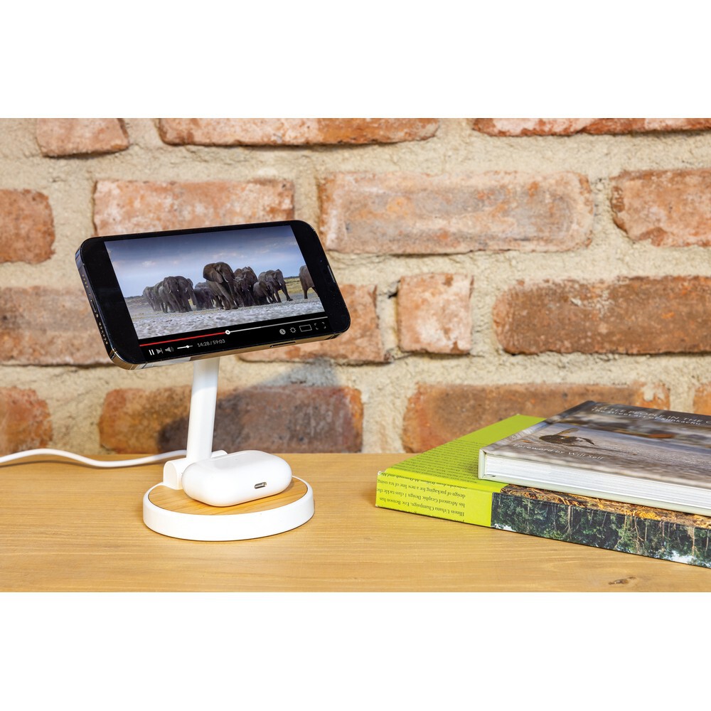 Ładowarka bezprzewodowa 2 w 1, magnetyczna ładowarka bezprzewodowa 15W, ładowarka bezprzewodowa 5W do słuchawek i drobnych akcesoriów, wykonana z ABS z recyklingu i bambusa z certyfikatem FSC®, działa z telefonami posiadającymi możliwość ładowania indukcyjnego, wejście 9V/3A, wyjście dla telefonu 9 V/1.1 A, 9 V/1.67 A, 15 W, wyjście dla słuchawek 5V/1A, 5W, kabel 120 cm z TPE z recyklingu w komplecie, w pudełku z certyfikatem FSC® mix
