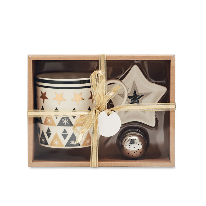 Świąteczny zestaw zawierający ceramiczny kubek, zaparzacz oraz mini talerzyk. Zapakowany w upominkowy kartonik z wierzchem z PVC, przewiązany ozdobną wstążką z etykietą.