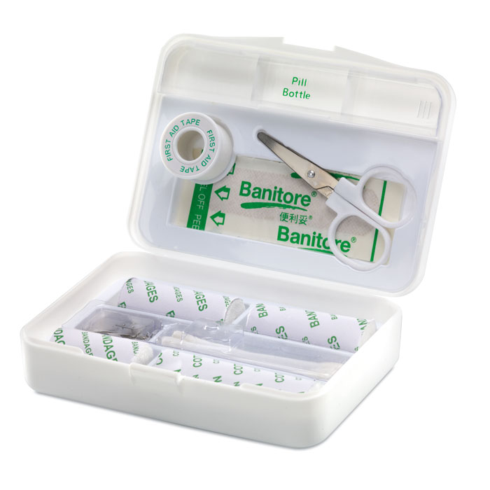 Plastikowa apteczka. 9 elementów jednorazowego użytku.