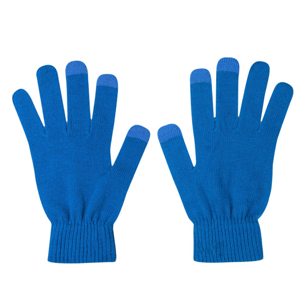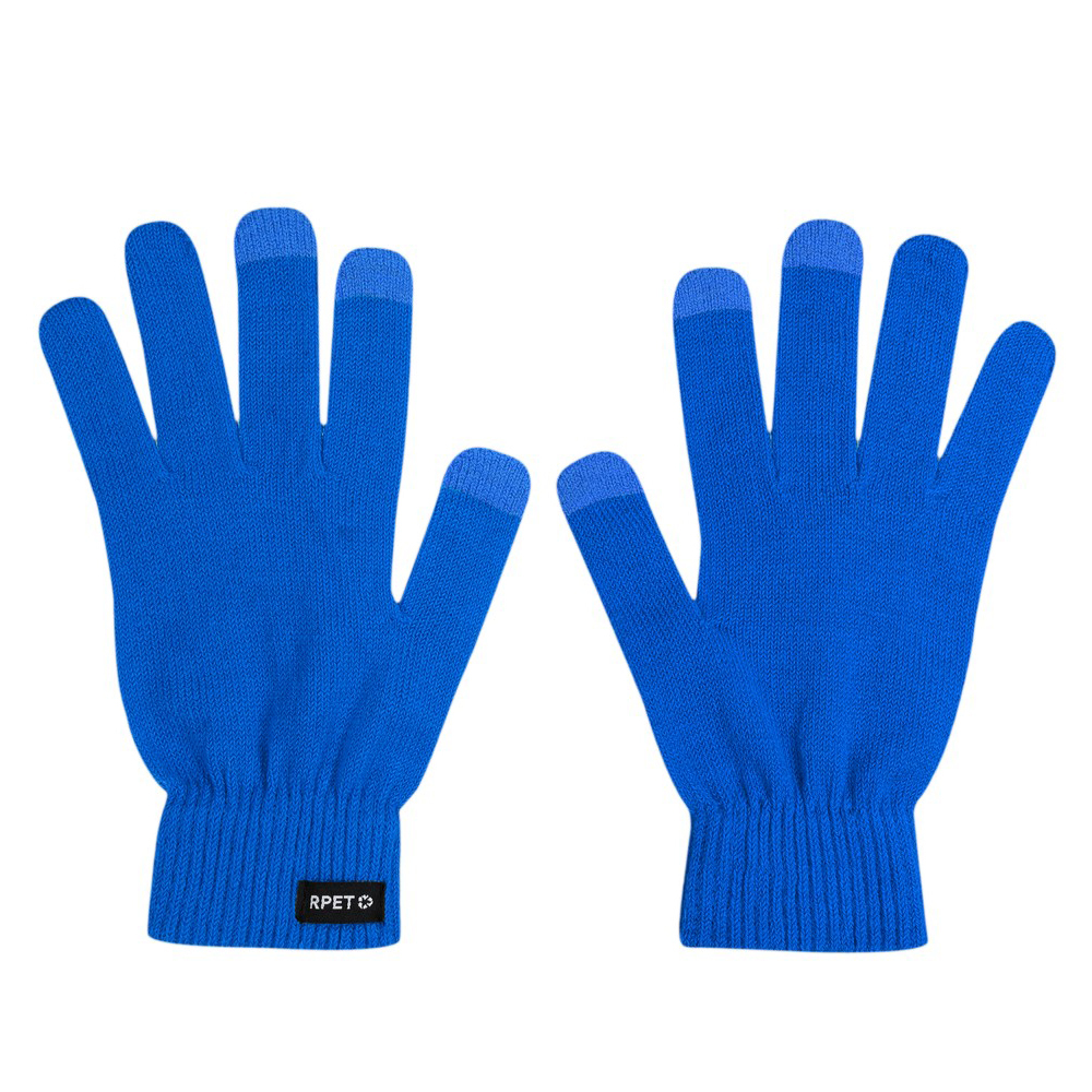Rękawiczki zimowe, posiadają 3 specjalne, dopasowane kolorystycznie końcówki umożliwiające obsługę ekranów dotykowych (kciuk, palec wskazujący oraz środkowy), jeden rozmiar dla dorosłych, ikona RPET na metce, produkt wykonany z RPET