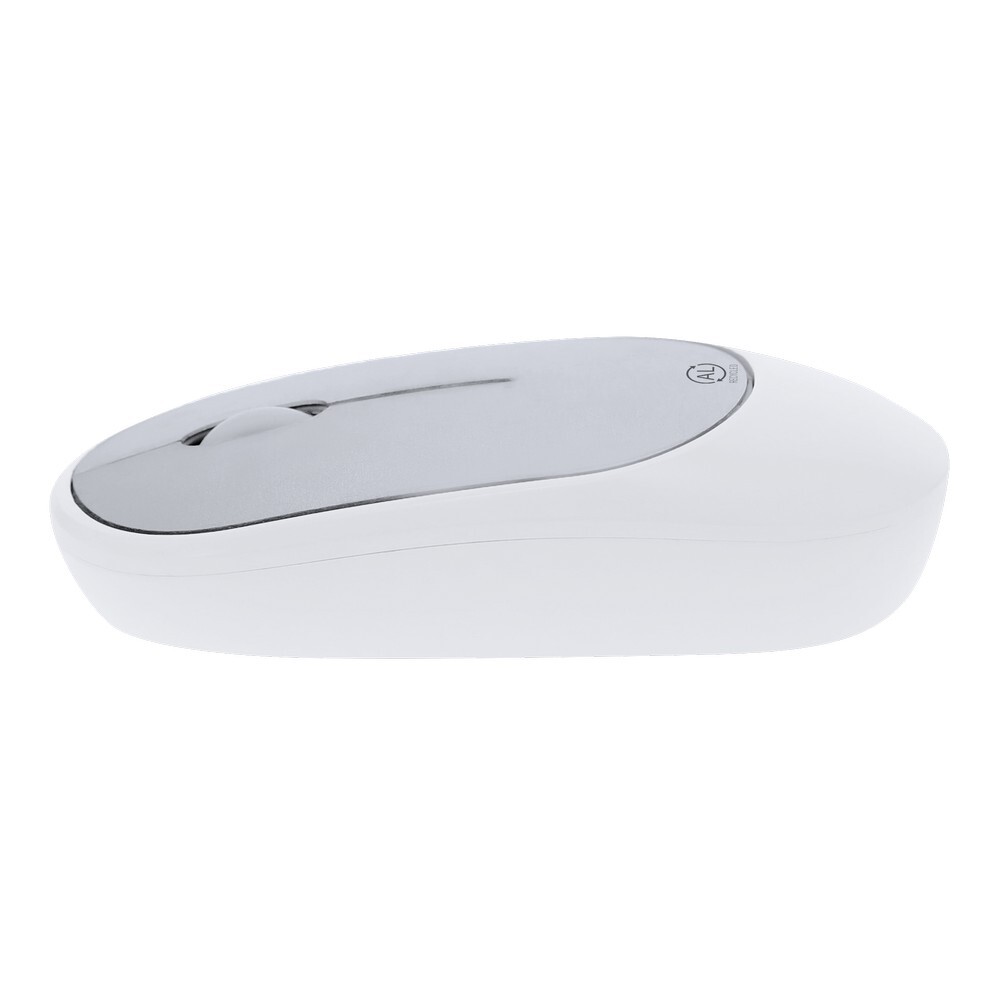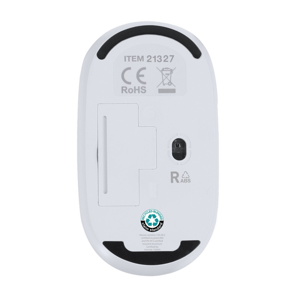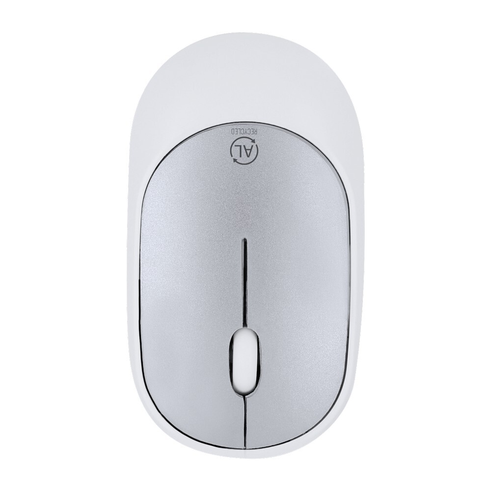 Bezprzewodowa, optyczna mysz komputerowa, posiada złącze USB w zestawie, ikona aluminium z recyklingu na produkcie, produkt wykonany z RABS i aluminium z recyklingu, zgodny z certyfikatem GRS (Global RecycIed Standard)