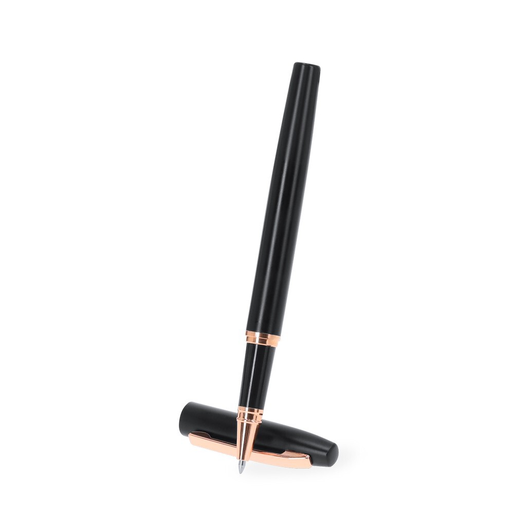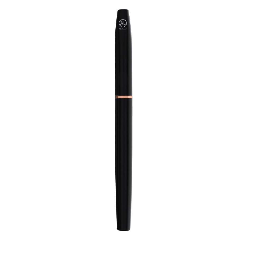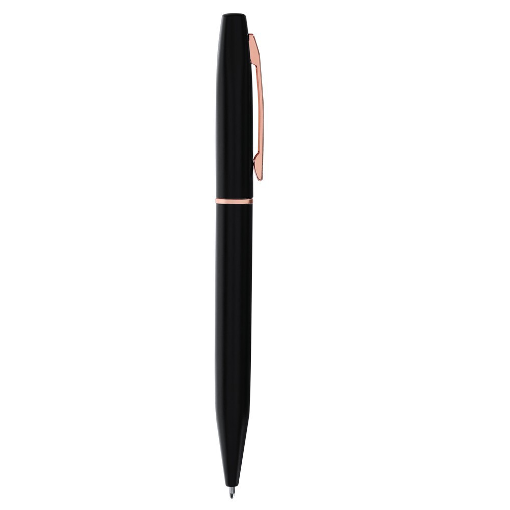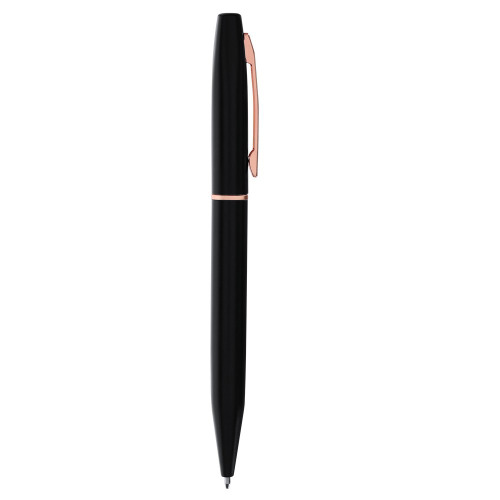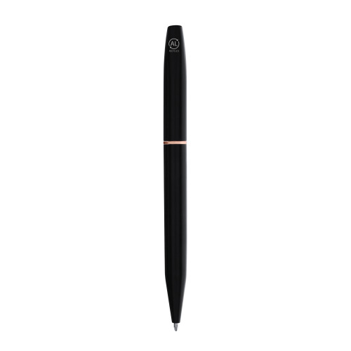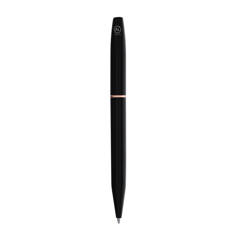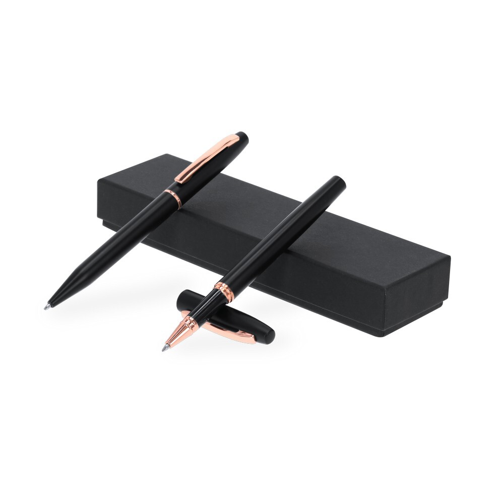 Zestaw piśmienniczy, długopis i pióro kulkowe z czarnym matowym wykończeniem i elementami w kolorze różowego złota, długopis z mechanizmem obrotowym, pióro kulkowe ze skuwką, posiadają metalowy klip, wkłady w niebieskim kolorze, czarne pudełko podarunkowe w komplecie, ikona aluminium z recyklingu na produkcie, zestaw wykonany z aluminium z recyklingu, zgodny z certyfikatem GRS (Global RecycIed Standard)