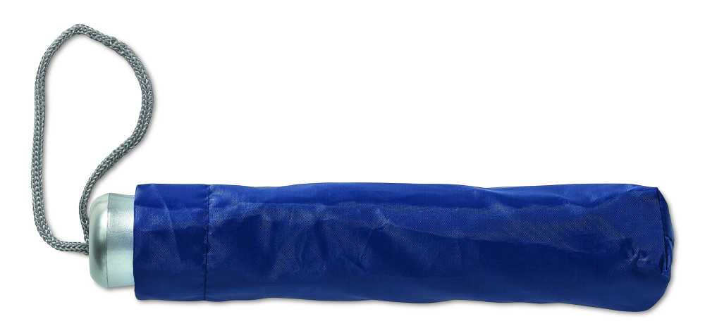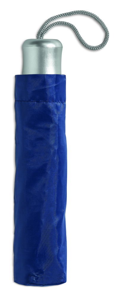 Ręcznie składana na 3, mini parasolka w etui. Średnica: 21 cali, wykonana z poliestru 190T. Trzon, żebra oraz końcówki ocynkowane. Srebrny, plastikowy uchwyt z paskiem na rękę. Dopasowane etui.