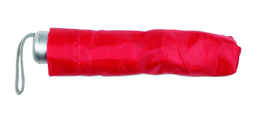 Ręcznie składana na 3, mini parasolka w etui. Średnica: 21 cali, wykonana z poliestru 190T. Trzon, żebra oraz końcówki ocynkowane. Srebrny, plastikowy uchwyt z paskiem na rękę. Dopasowane etui.