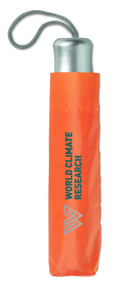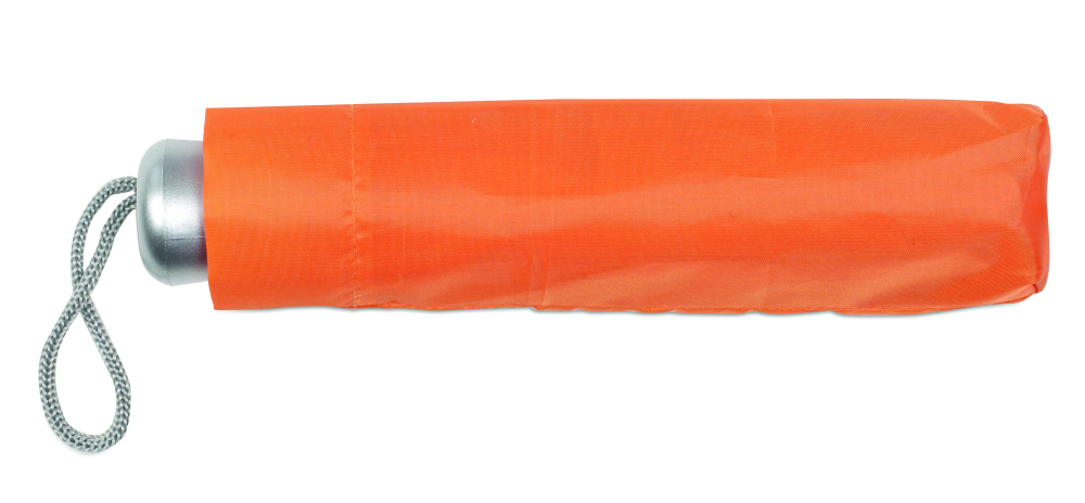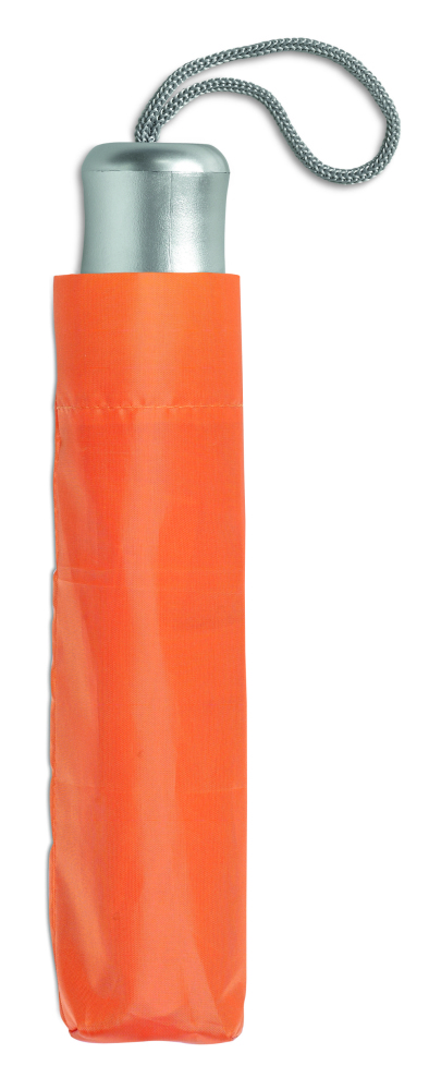 Ręcznie składana na 3, mini parasolka w etui. Średnica: 21 cali, wykonana z poliestru 190T. Trzon, żebra oraz końcówki ocynkowane. Srebrny, plastikowy uchwyt z paskiem na rękę. Dopasowane etui.