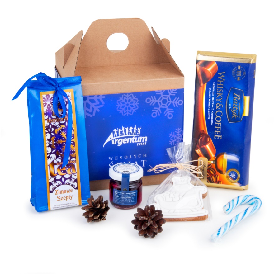 Całość w pudełku ozdobnym z rączką. Na pudełku obwoluta według indywidualnego projektu + logo. Wymiary zestawu: 15x15x15cm